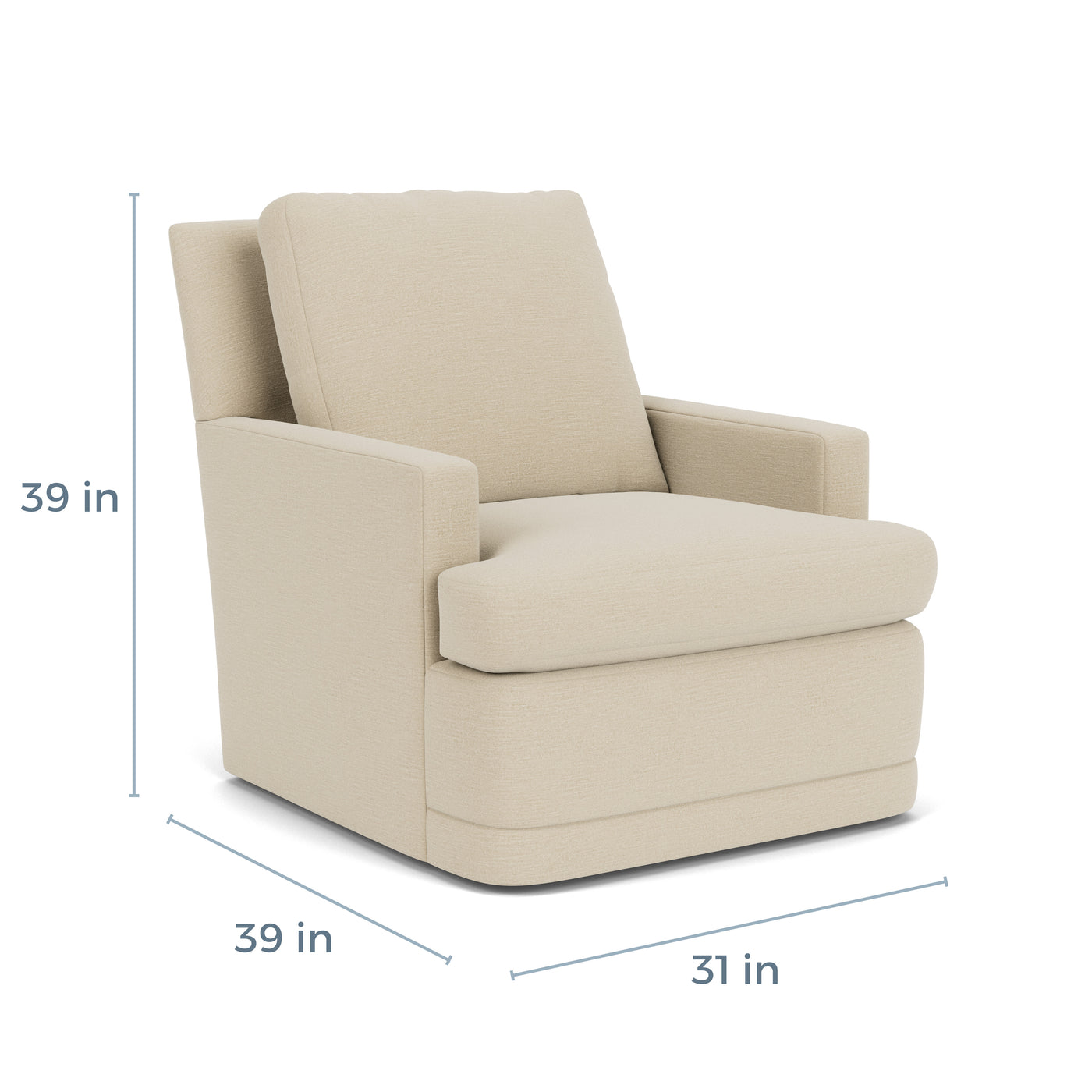The Avondale Park Swivel Chair, handcrafted in North Carolina, combines traditional craftsmanship with comfort-focused design with the added functionality of swivel movement. Featuring square armrests and a plush back cushion, its fully tailored base adds a touch of elegance. The back's slight outward angle ensures maximum comfort, making it a refined choice for any living space.