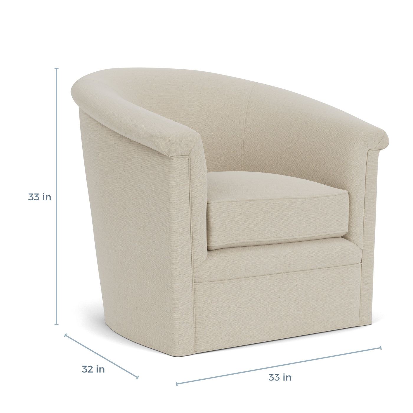 The Barclay Swivel Chair, with its snug seating structure, is designed to offer a cozy and enveloping feel, enhancing the comfort level. Handcrafted in North Carolina, it features a low back that features a gentle roll of the fabric so that the welt is on the outside of the chair which enhances the aesthetics and comfort. The chair's smooth swivel function adds dynamic versatility, while its contemporary sloped barrel back and tight, welted seat cushion ensure both style and comfort.