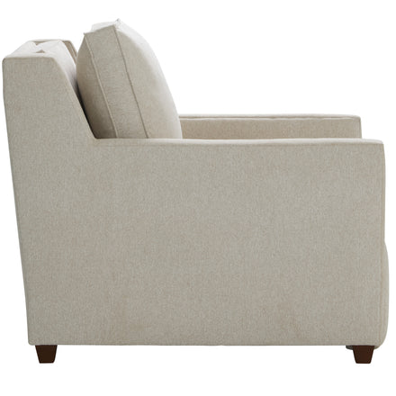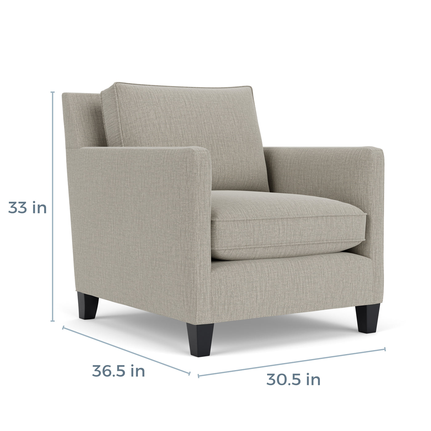 The Carter Chair embodies the same sophisticated comfort as its sofa counterpart, with transitional track arms, a plush single seat cushion, and elegant tapered wood legs. This chair offers a cozy spot to unwind, featuring a high back and angled arms, complemented by a loose back cushion for added comfort. Its clean lines and tightly fitted skirt frame contribute to a minimalist yet elegant aesthetic. Handcrafted in North Carolina, each Carter Chair is a unique piece designed to elevate any living space with its stylish and inviting presence.