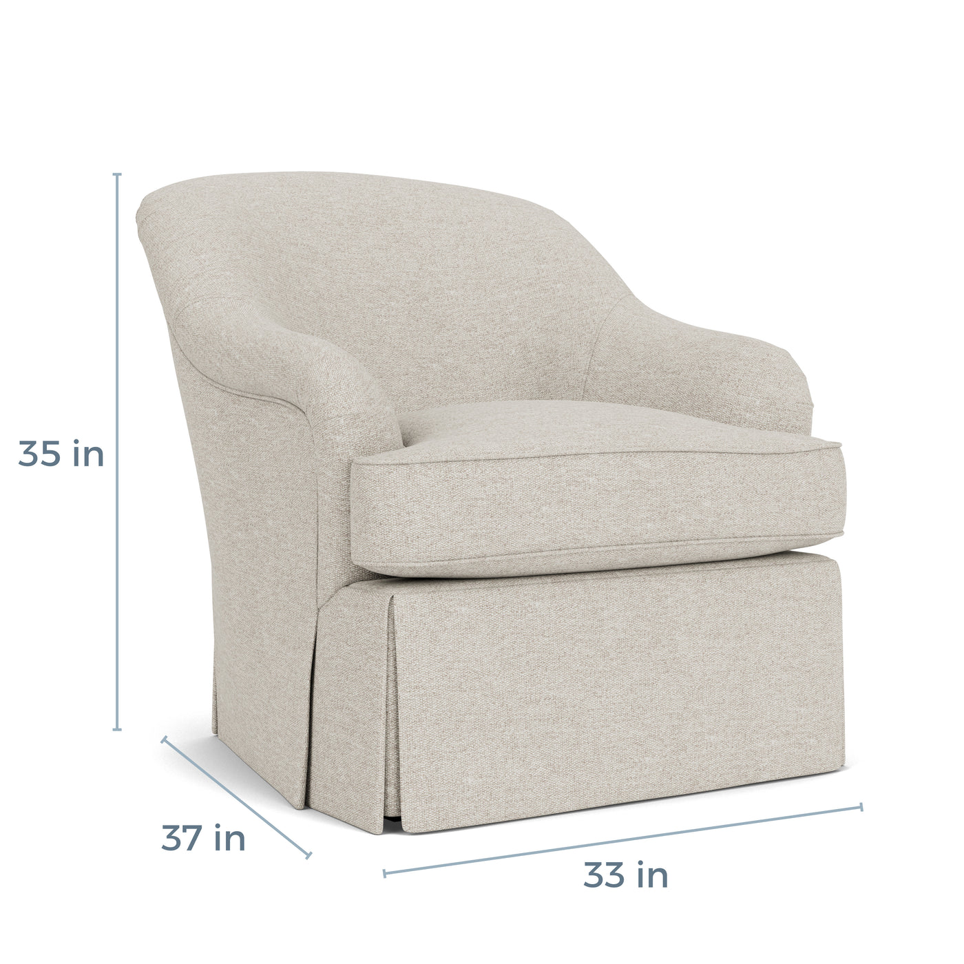 The Dorian Falls Chair marries modern design with traditional comfort, featuring a slight barrel back and sloped arms that evoke an English-roll style, accented with an exterior welt for an extra touch. The skirted base, finished with kick pleats, gives this chair a polished look. Handcrafted to be both stylish and comfortable, it's equipped with a plush cushion that invites relaxation, making it an exceptional choice for any refined living space. Handcrafted in North Carolina by experts artisians.