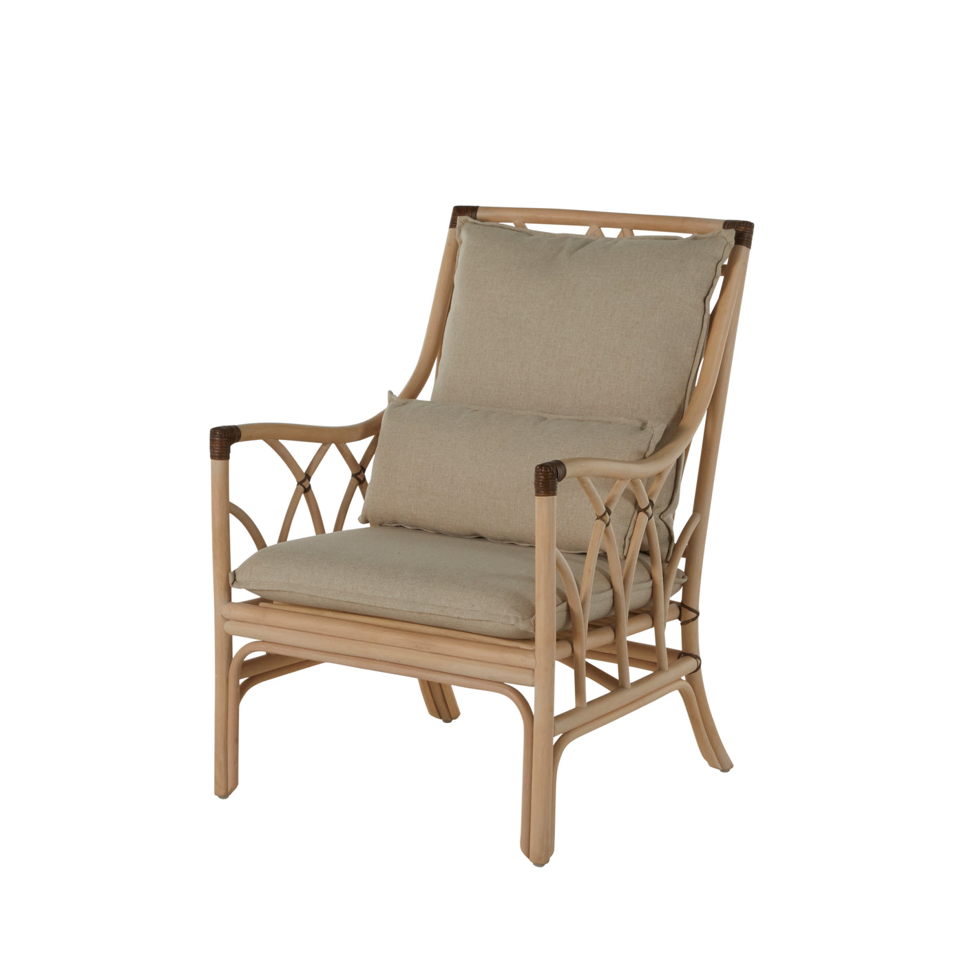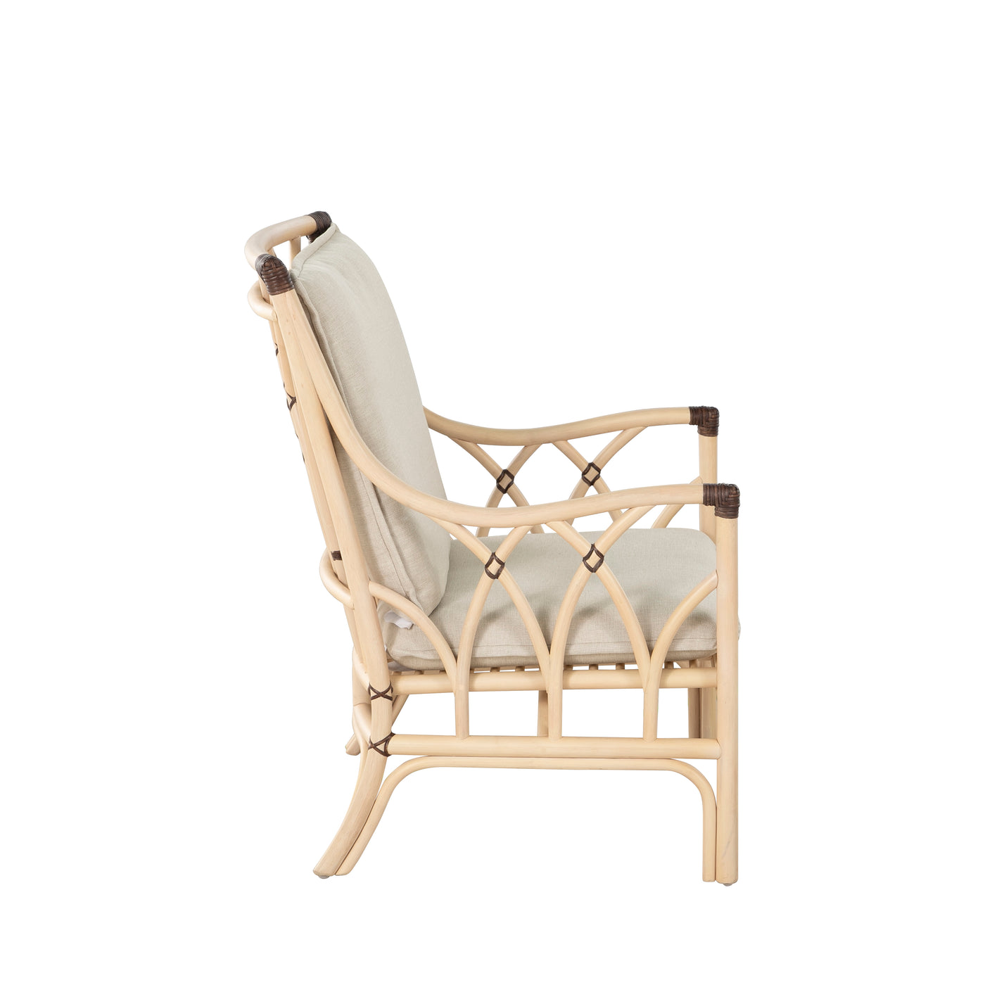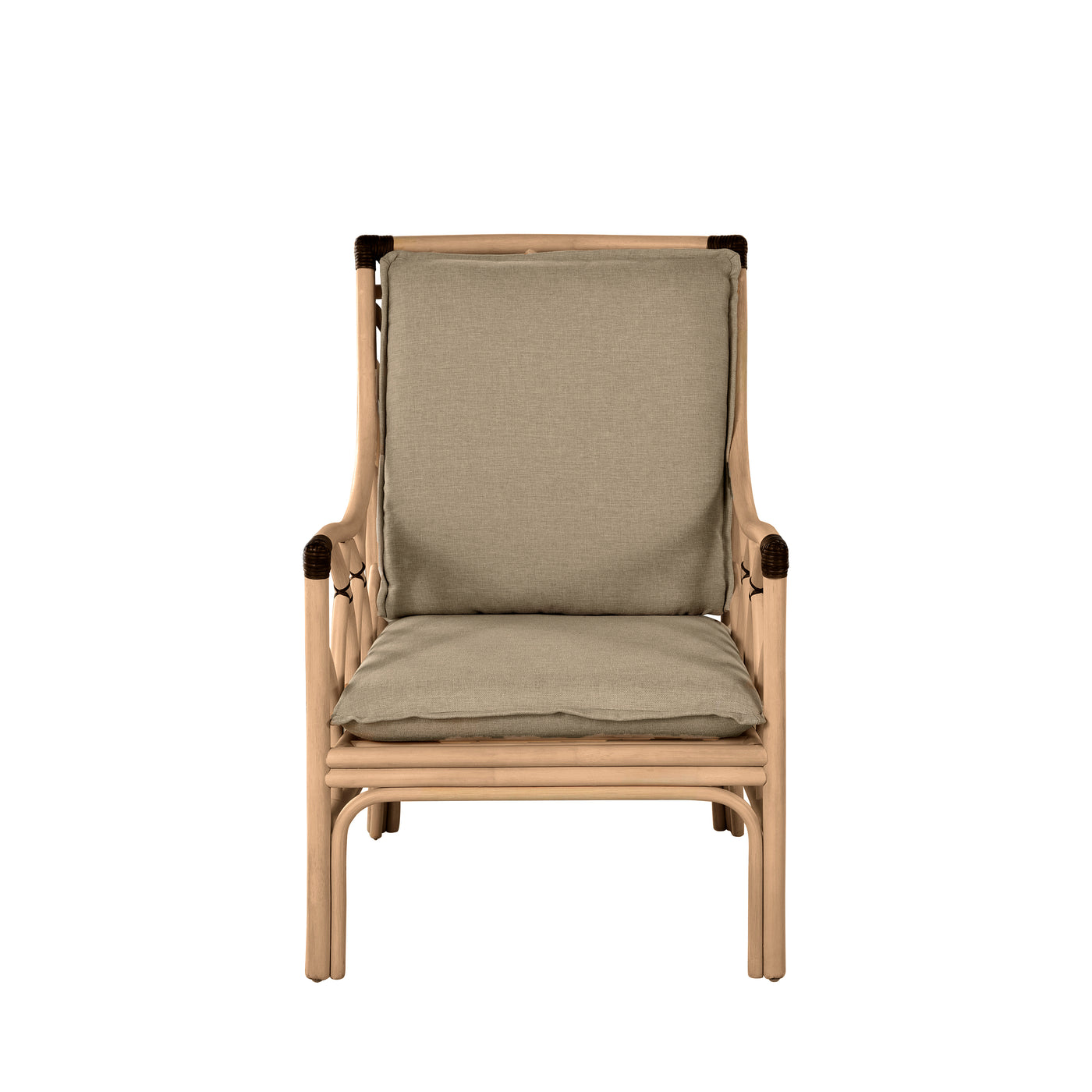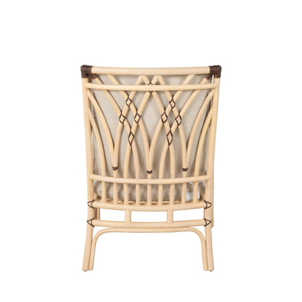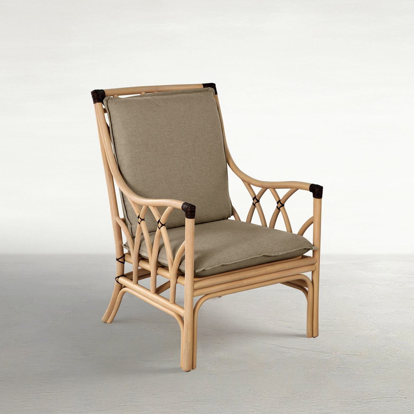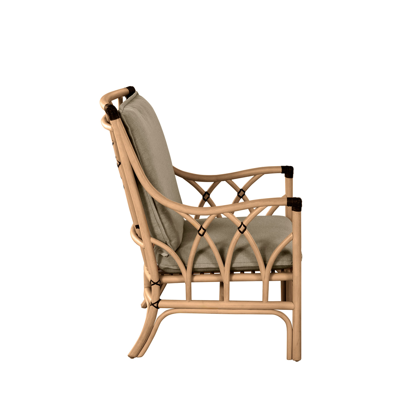 The Milano Lounge Chair merges traditional craftsmanship with a modern twist, making it an ideal addition to any room. Its natural rattan frame is meticulously hand-wrapped in a contrasting black rattan at the intersections, adding an artistic touch to the classic design. The beige linen-blend cushion provides plush comfort, while the black leather accents offer a sophisticated touch. This versatile chair is perfect for living rooms, sunrooms, or bedrooms, enhancing your space with its elegant and transitional style.