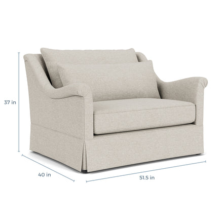 The Winslow Chair and a Half expands on the celebrated comfort and feminine elegance of the Winslow collection, offering the widest seating in our lineup, affectionately known as "a chair and a half". Handcrafted in North Carolina, it features the collection's signature deep seating, graceful curves, and a tightly upholstered, skirted frame, providing a stylish sanctuary. This generously proportioned chair, complete with a kidney pillow for added support, perfectly blends classic allure with modern comfort, making it a luxurious addition to any space.