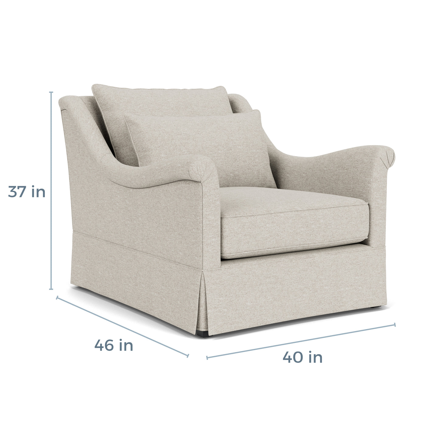 The Winslow Chair & 1/2 expands on the celebrated comfort and feminine elegance of the Winslow collection, offering the widest seating in our lineup, affectionately known as "a chair and a half". Handcrafted in North Carolina, it features the collection's signature deep seating, graceful curves, and a tightly upholstered, skirted frame, providing a stylish sanctuary. This generously proportioned chair, complete with a kidney pillow for added support, perfectly blends classic allure with modern comfort, making it a luxurious addition to any space.