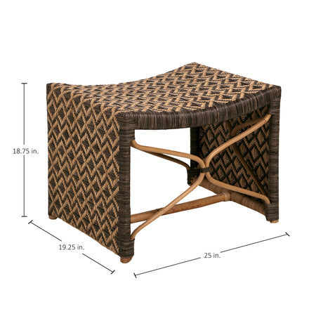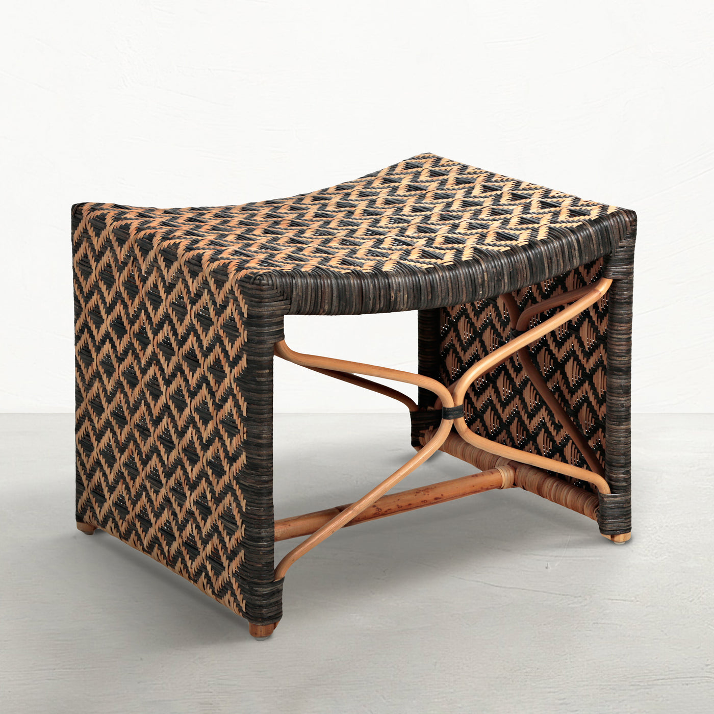 The Bennet Stool features a graceful waterfall silhouette crafted from two-tone handwoven rattan, creating a captivating intertwined diamond pattern. The ecofriendly and contrasting black and natural rattan enhances the stool's visual appeal, while the frame is supported by two curved X-shaped stretchers held together by a black binding, providing both style and stability. As rattan is a natural material, expect unique variations that add to the charm and character of this exquisite piece, perfect for any living space. The Bennet Stool is not only a beautifully artisanal crafted addition to your home but also a sustainable choice, perfect for those who value both aesthetics and environmental responsibility. Ideal for dining rooms or as a statement piece in any room.