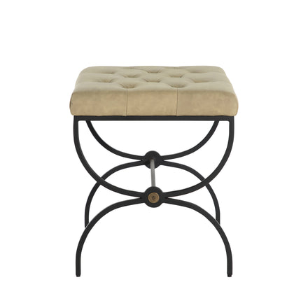 The Galvin Stool reflects Gabby's homage to the tapestry of design eras, presenting a modern interpretation of a timeless ottoman. It merges a brushed brass frame with the vintage charm of a tufted light gray leather cushion, offering an accent piece that pays tribute to classic elegance while seamlessly fitting into contemporary spaces. The natural variations in leather ensure that each stool bears unique characteristics.