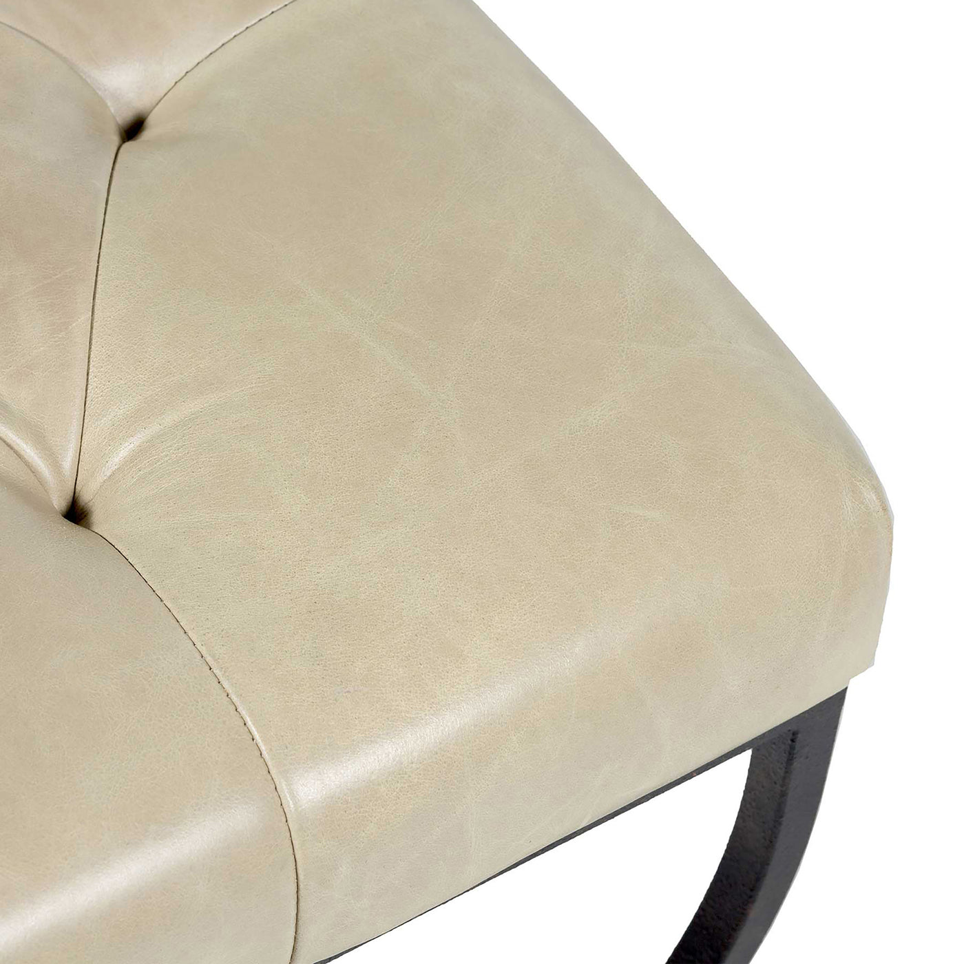 - Upholstered in light gray tufted leather for vintage charm and tactile comfort