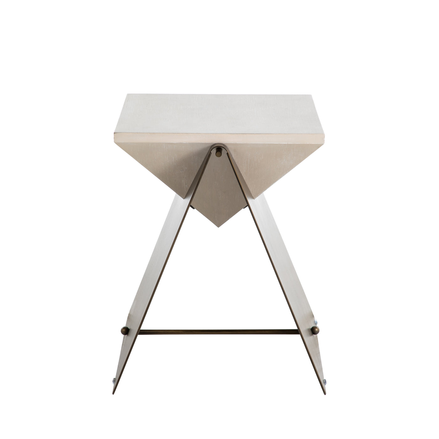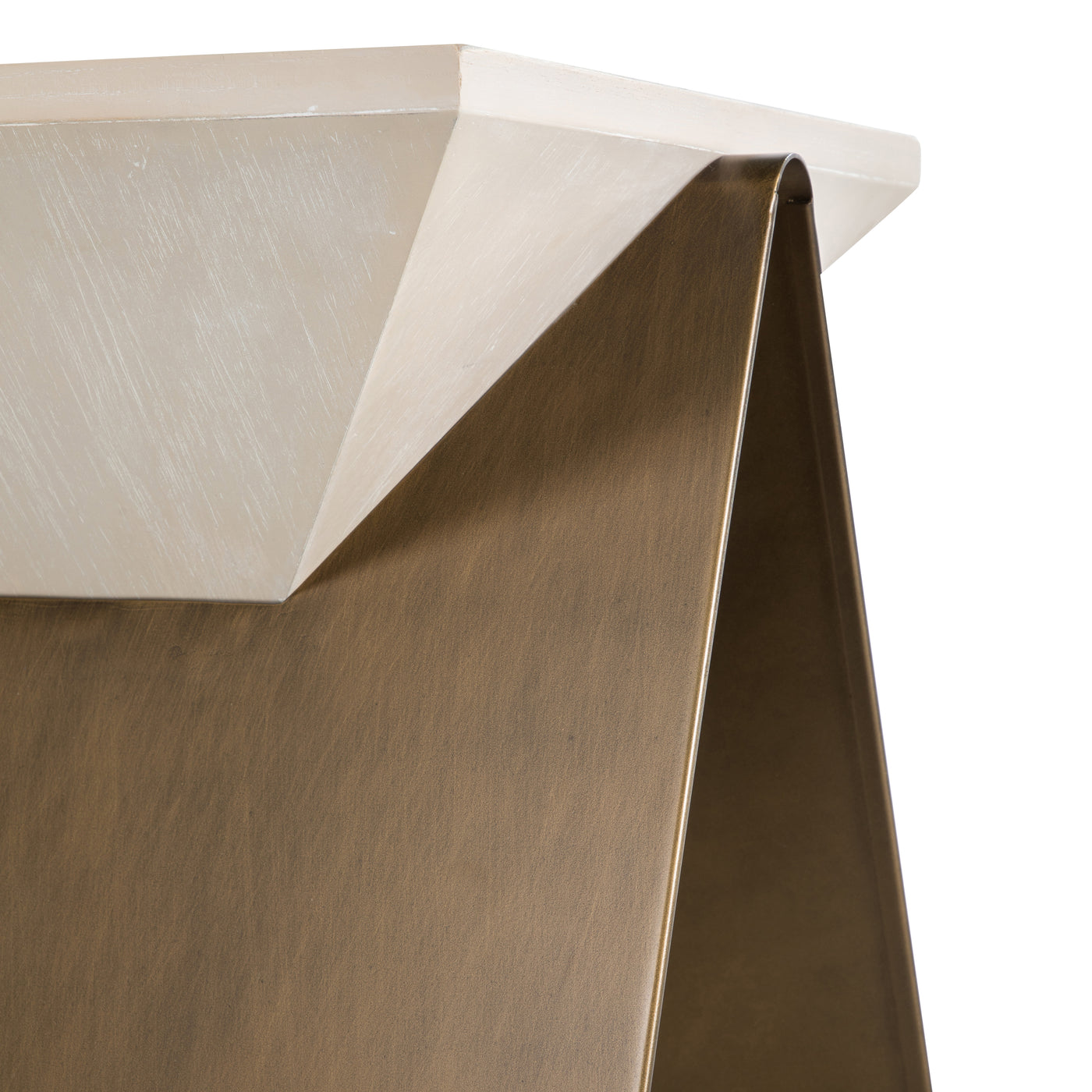 The Cornet Side Table is a masterful blend of geometric design and mixed materials. Featuring a striking contrast of brushed brass and cerused white oak finishes, this side table stands out with its sculptural silhouette. The table top is crafted from engineered wood overlaid with an oak veneer finished with a hand-applied technique to accentuate the grain of the wood. The unique shape and modern aesthetic make it a perfect accent piece for any contemporary living space. Natural material variations in color and pattern add to its distinctive charm, ensuring each piece is truly one-of-a-kind.
