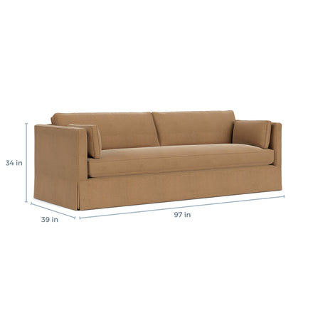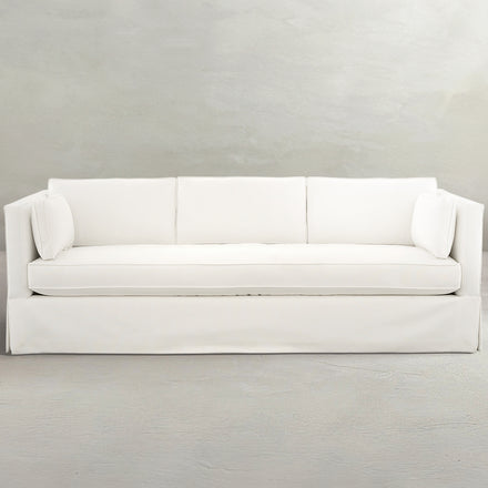 Striking a harmonious balance between contemporary flair and traditional grace, the Grand Sofa features a chic tailored skirt and sleek lines, exuding timeless elegance. The modern bench seat and optional elongated back cushions offer a fresh look, while the luxurious seating invites extended lounging sessions. Notably, it's a lower-back sofa, with armrests and the back maintaining equal height, enhancing its sleek silhouette and making it a versatile choice for diverse living spaces.