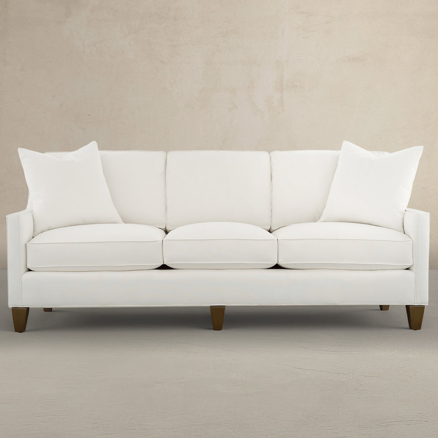 The Lebaron Sofa, masterfully handcrafted in North Carolina, is a testament to skilled artisanship. It features a sleek profile with a minimalist edge, complemented by tapered legs for a clean, modern aesthetic. The sofa offers a contemporary feel by blending subtly curved arms with precise and tight tailoring. It's plush one bench seating ensures luxurious comfort and sits atop three tapered wooden legs. This piece, made with precision and care, exemplifies the fusion of comfort and style in furniture design.