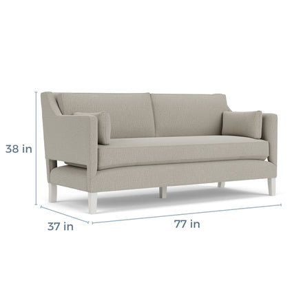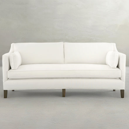 The Mieola Sofa, with its minimalist aesthetic and alluring design, features sleek lines and a tailored look. Its angled arms and clean profile are underscored by the subtle addition of bolster pillows for a touch of elegance. The arms are characterizterized further by an streamlined opening along the bottom and across the back of the sofa. Handmade in North Carolina, this sofa is both a statement piece, offering inviting cushions and a polished design, perfectly suited for contemporary living spaces.