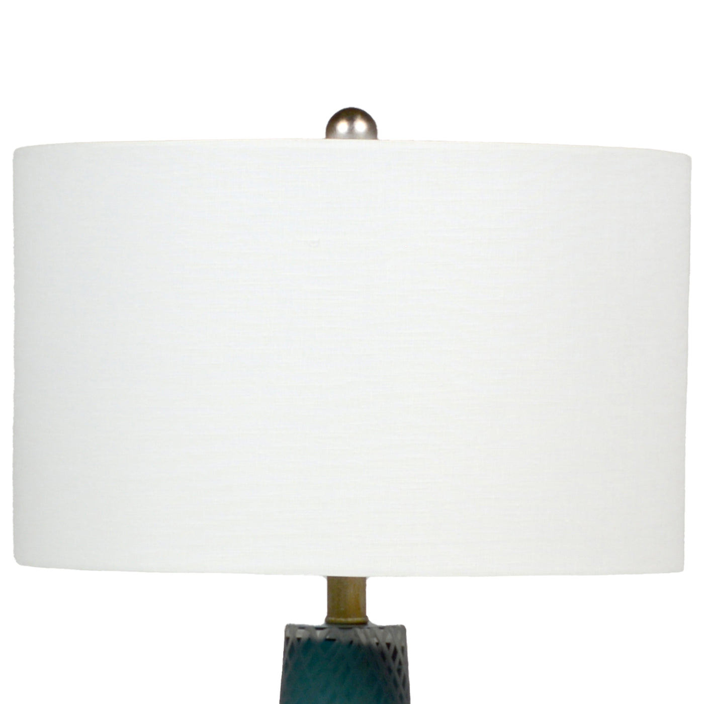 The Brianna Table Lamp features a tall, tapered conical blue glass base adorned with a hand-cut diamond pattern. This elegant and sophisticated lamp is perfect for adding a touch of refinement to any room, whether its the sunlight dancing through the glass or the illumination it gives off at night. The handmade nature of the glass ensures that each lamp has slight, but beautiful, differences, making each piece unique. The lamp is topped with a classic white drum shade that complements its striking base, creating a harmonious balance between contemporary design and artisanal craftsmanship.