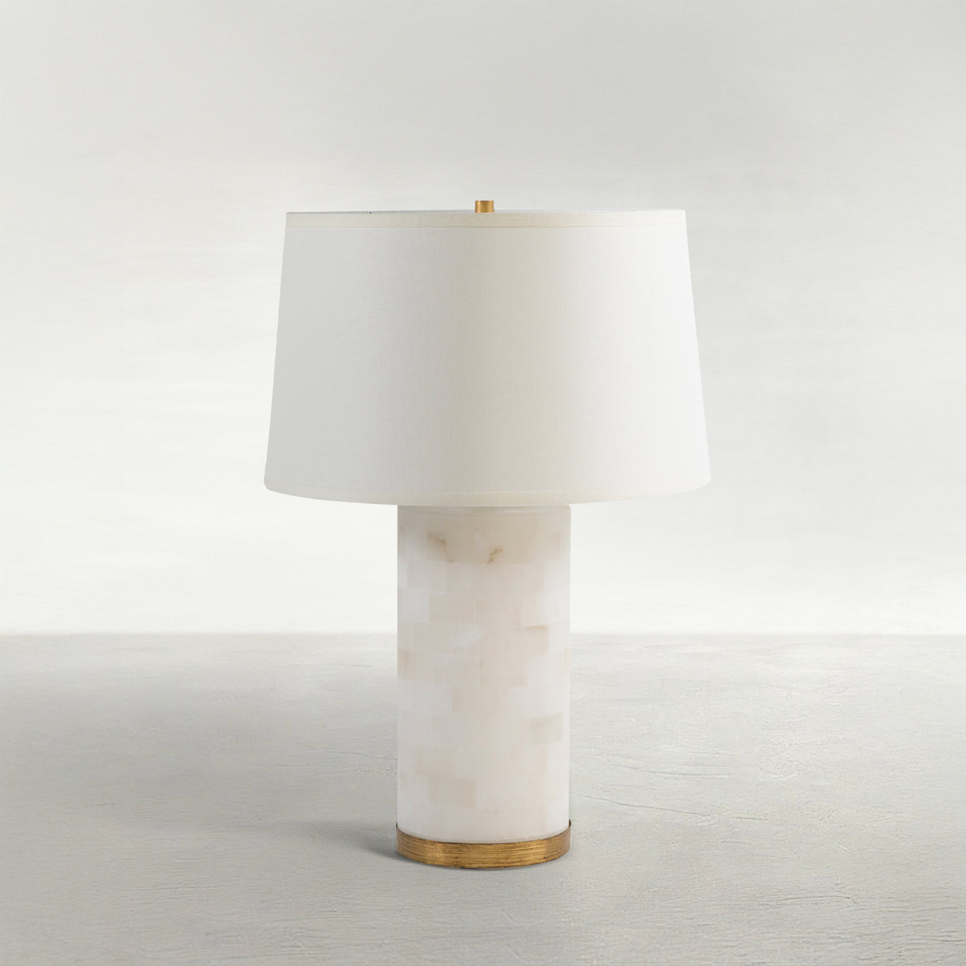 The Maple Table Lamp features a large and round tiled alabaster column base with an integrated nightlight controlled by a four-way switch inside the shade, giving a warm and ambient glow inside the alabaster. The gilded gold metal accents add a touch of luxury, while the natural variations in the alabaster make each lamp unique. This transitional piece is perfect for adding warmth and elegance to any room.