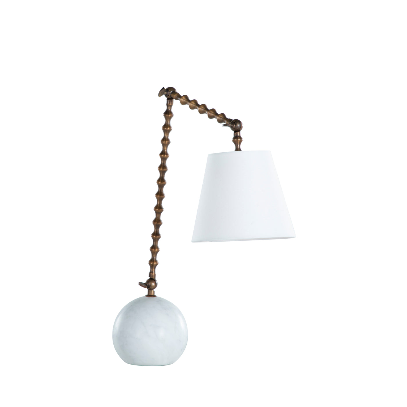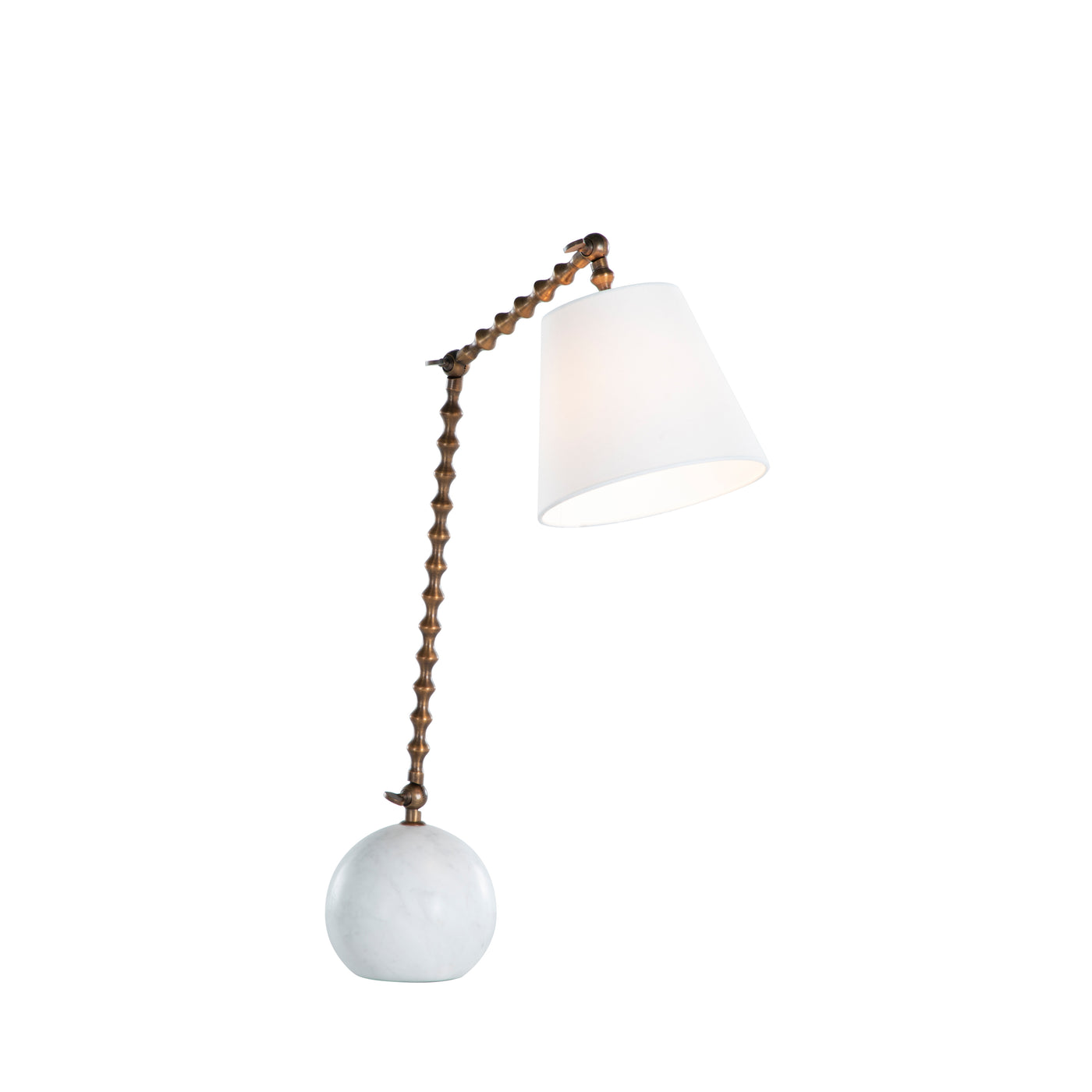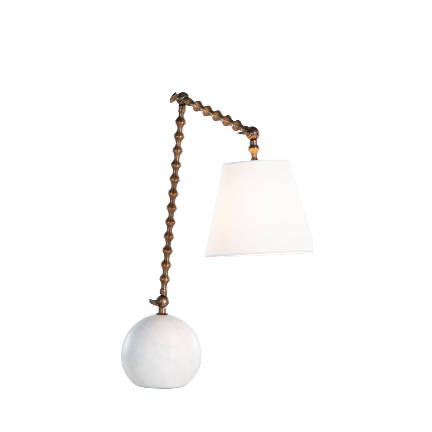 The Nadine Task Lamp is a stylish take on the home-office desk lamp with an antique brass knobbed stem rising from a natural alabaster ball. The antique brass finish brings warmth to the overall design, contrasting the pale stone and the linen shade. The clever fixture is adjustable at two different junctions allowing the light to be directed in a number of directions.