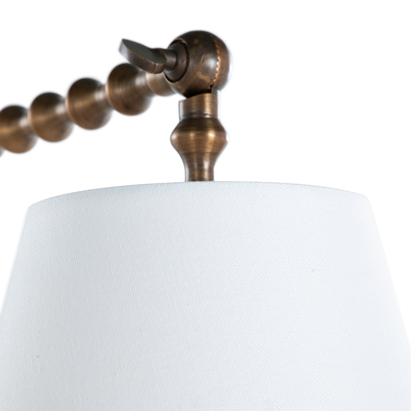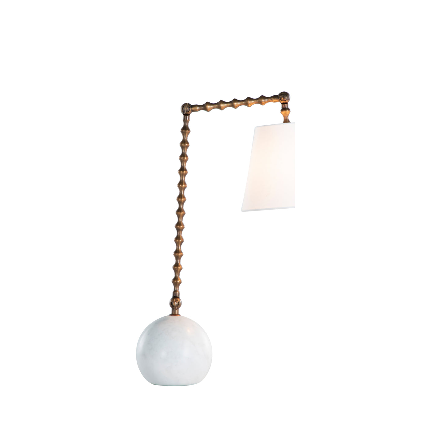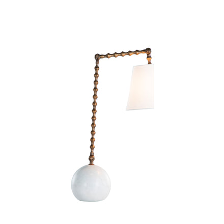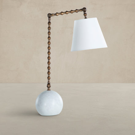 The Nadine Task Lamp is a stylish take on the home-office desk lamp with an antique brass knobbed stem rising from a natural alabaster ball. The antique brass finish brings warmth to the overall design, contrasting the pale stone and the linen shade. The clever fixture is adjustable at two different junctions allowing the light to be directed in a number of directions.