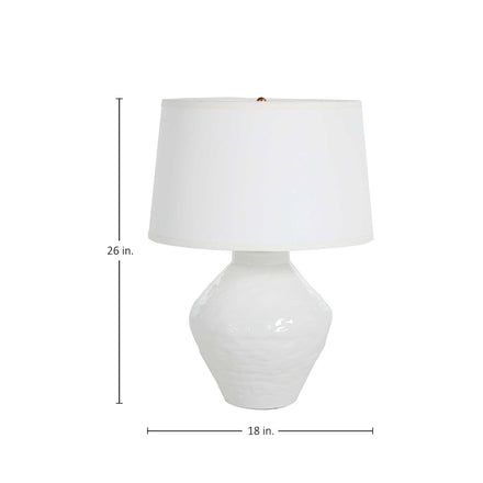 The Osborn Table Lamp blends classic elegance with artisanal craftsmanship, featuring an all-white ceramic base paired with a white linen shade. This monochromatic accent lamp offers a timeless look, perfect for any room in your home. Each lamp is handmade, resulting in slight variations in height that add to its unique charm. The textured white finish and antique brass accents enhance its sophisticated appeal, making it a versatile piece that complements both traditional and contemporary interiors. Illuminate your living room, bedroom, or office with the understated beauty of the Osborn Table Lamp.