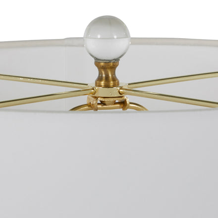 Adjustable extension arm No Ampere requirement 1 Base general color White Brand Gabby Bulb included No Certifications and compliance Prop 65 Lead, UL, UL Dry Country of origin CHN Contract viable Yes Dimmable No Finial shape Sphere Finish family White Hardware finish Brass Harp finish Brass Has diffuser No Has shade Yes Light direction Ambient Material Ceramic, Crystal Natural material disclosure Natural Number of bulbs 1 Power source 2 Prong Plug Removable shade Yes Switch type 3-Way, Turn