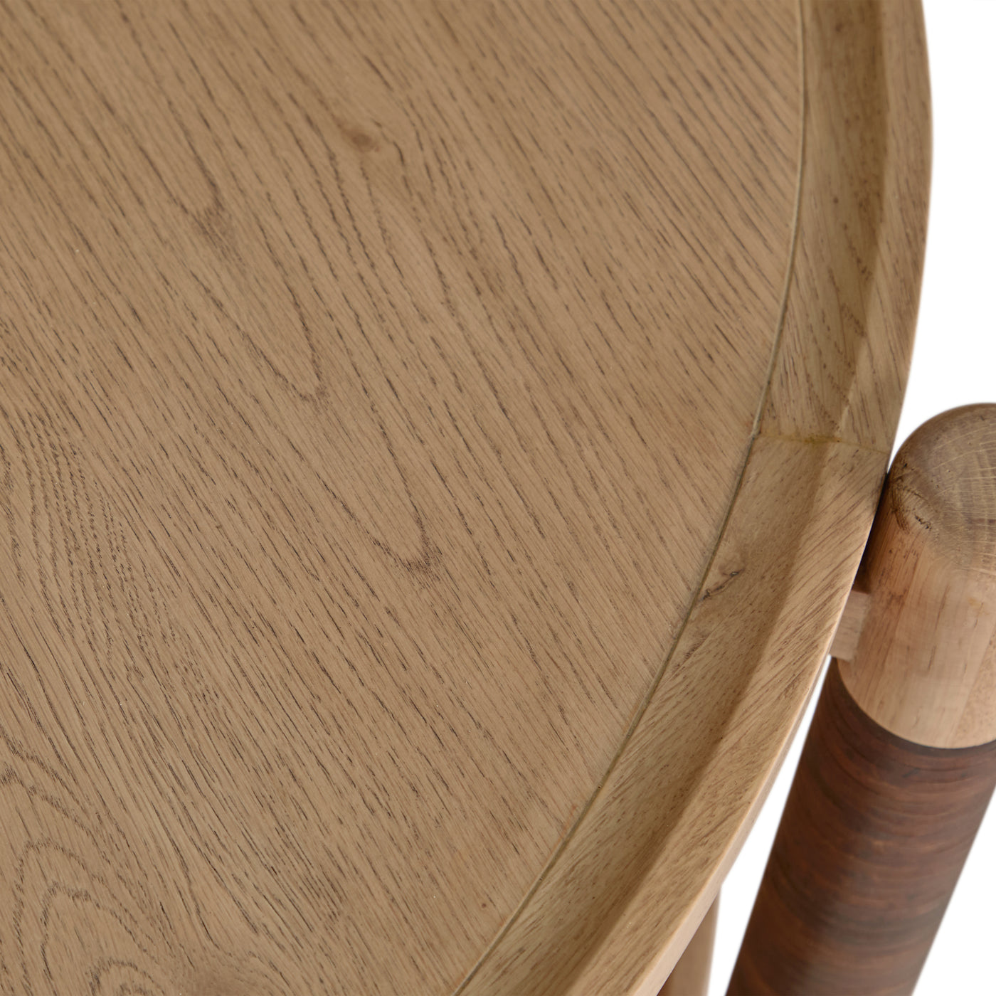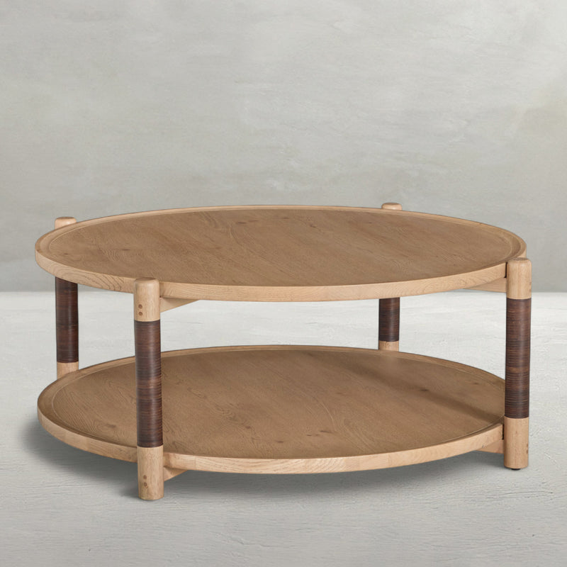 The Linden Coffee Table – Dawn exudes warmth and quiet sophistication through its oak construction and artful detailing. Finished in Dawn, the surface reveals a rich, tactile grain that enhances its organic character. The wide, round profile offers generous space for display and entertaining, while the second shelf adds functional versatility. Each leg is hand-wrapped in dark brown leather, introducing a luxurious touch that contrasts beautifully with the light oak tones. Thoughtful joinery and balanced proportions make the Linden Coffee Table a statement of refined craftsmanship and modern ease.