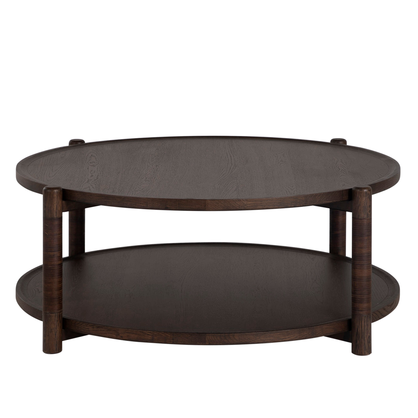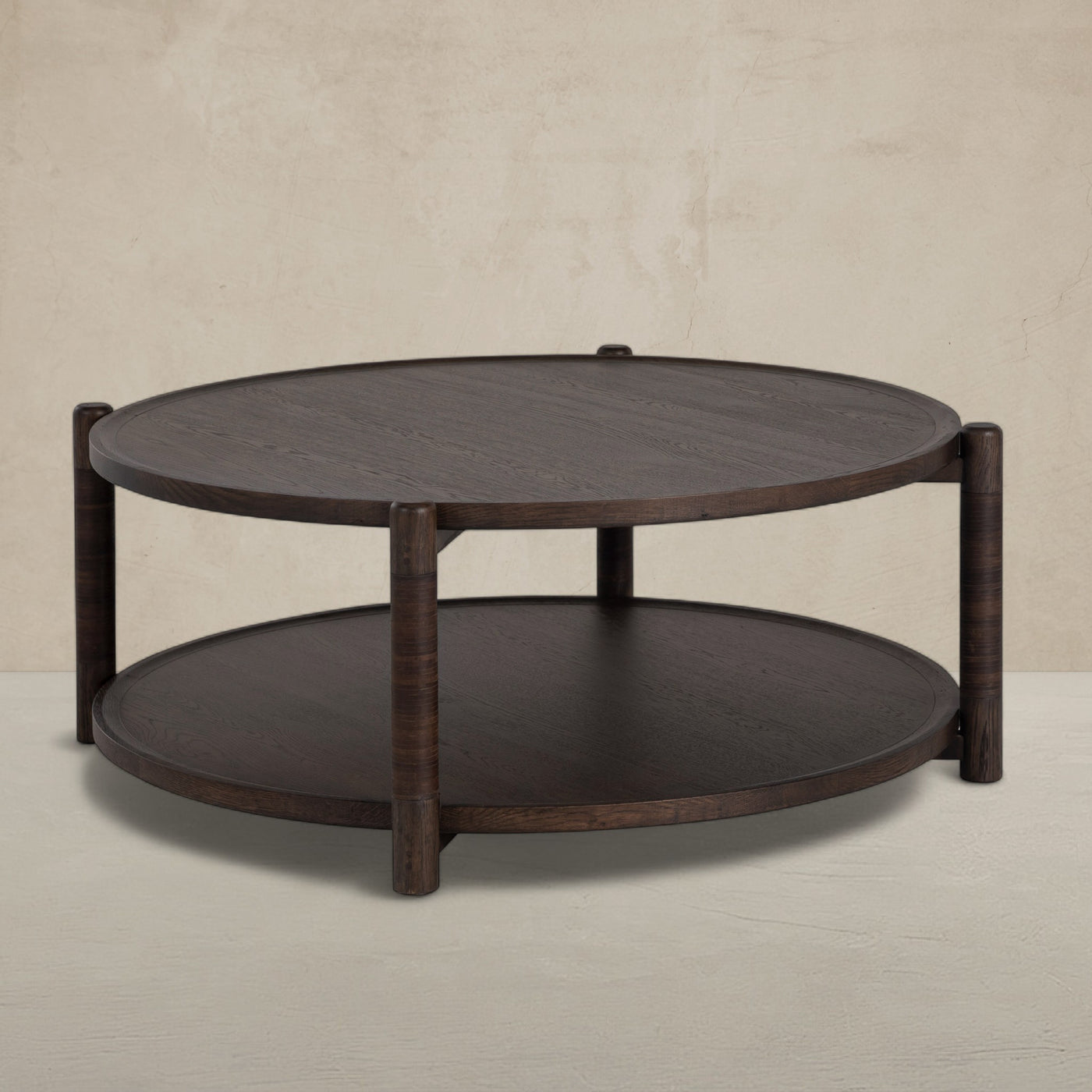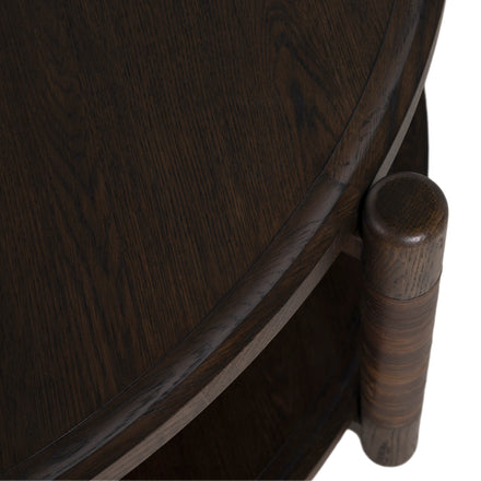 The Linden Coffee Table – Dusk balances natural texture with elevated design. Crafted from oak in the deep Dusk finish, the table’s rich tone enhances the grain’s natural movement, creating an elegant and grounded presence. Its wide circular form offers ample surface space, while the lower shelf provides added functionality. The dark brown leather wrapping on the legs introduces a handcrafted touch that pairs beautifully with the finish’s warm, moody depth. Designed with timeless joinery and enduring style, the Linden Coffee Table – Dusk anchors a space with quiet confidence and refined charm.