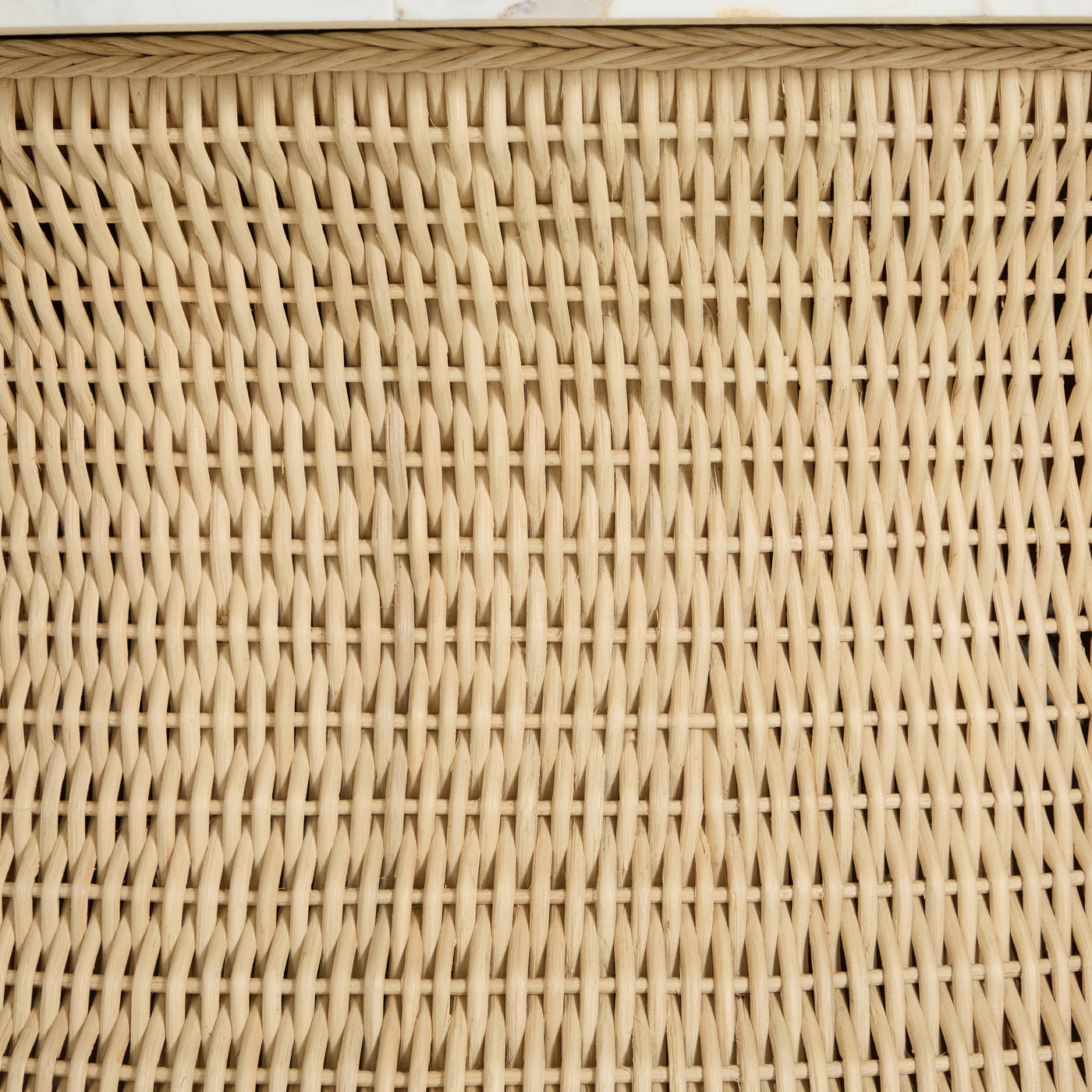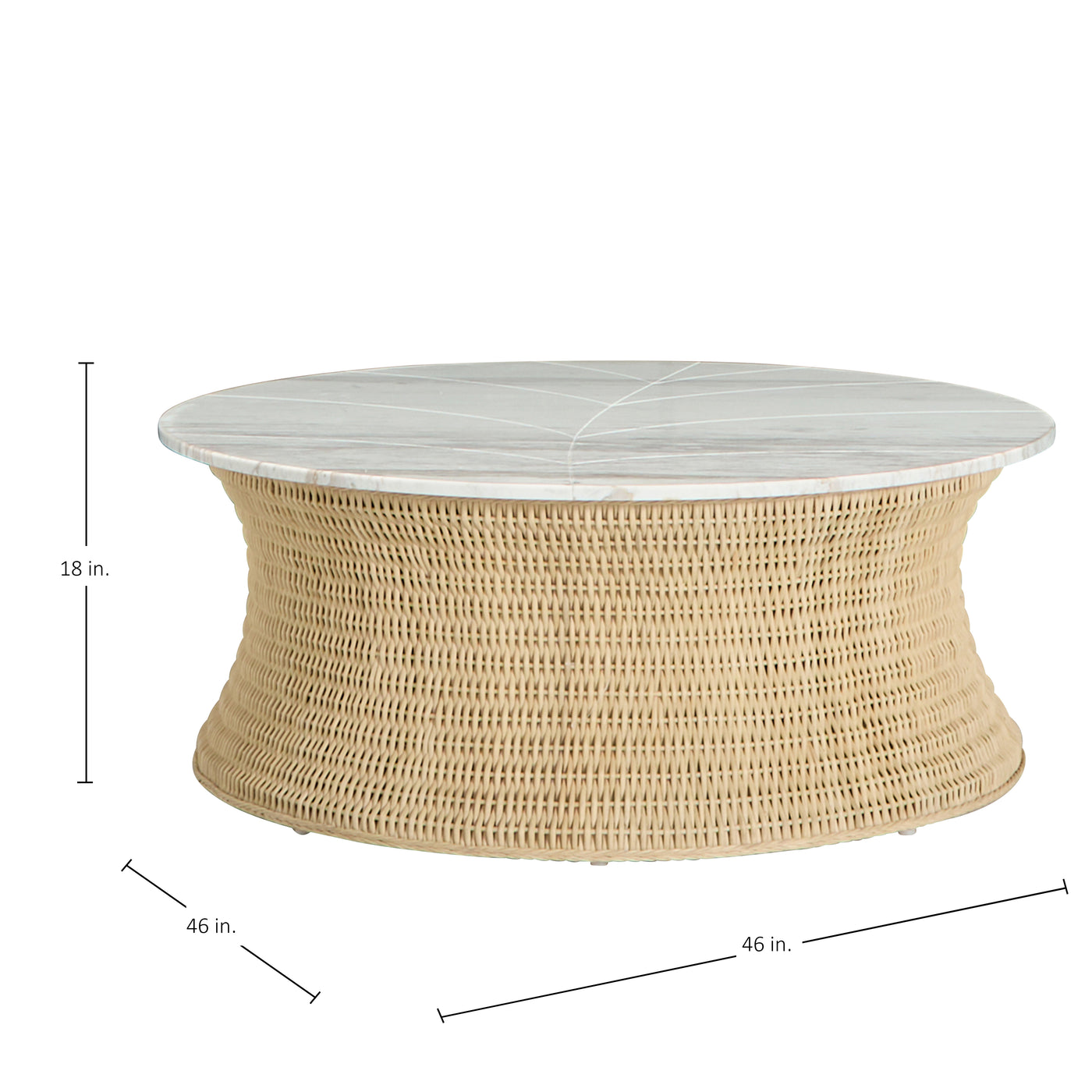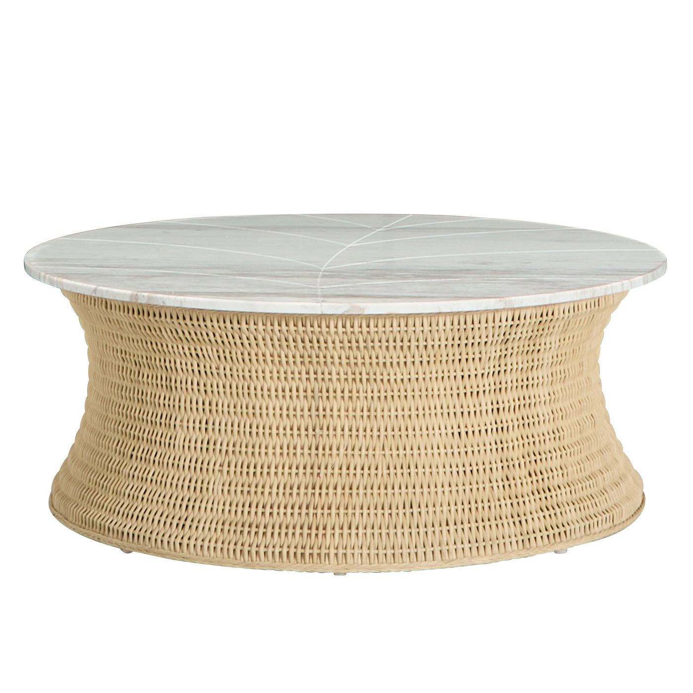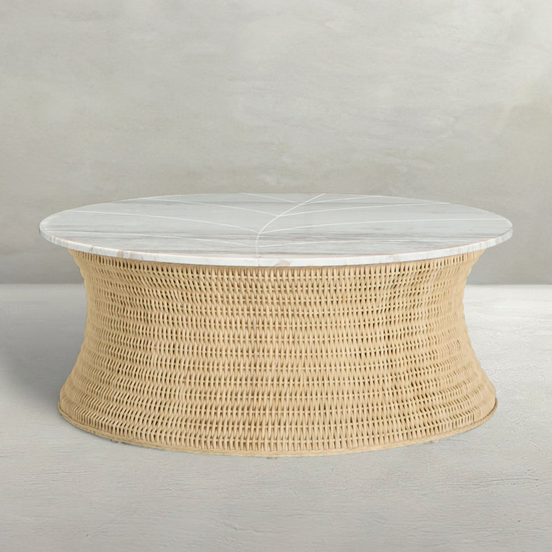 The Marina Coffee Table balances natural texture and refined elegance, featuring a beautifully handwoven base of bleached wicker paired with a Volakas marble top etched with a delicate leaf design. Its rounded silhouette creates a soft, inviting presence, while the combination of organic materials and sculptural form adds depth and sophistication. Designed to anchor a living space with effortless style, the Marina brings an airy, coastal-inspired charm that complements a range of aesthetics—from relaxed modern to refined coastal living.