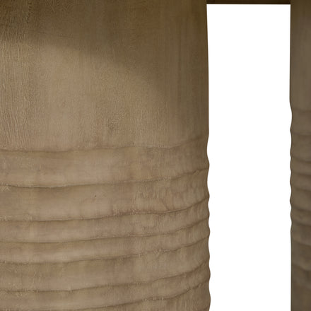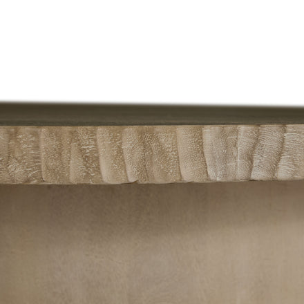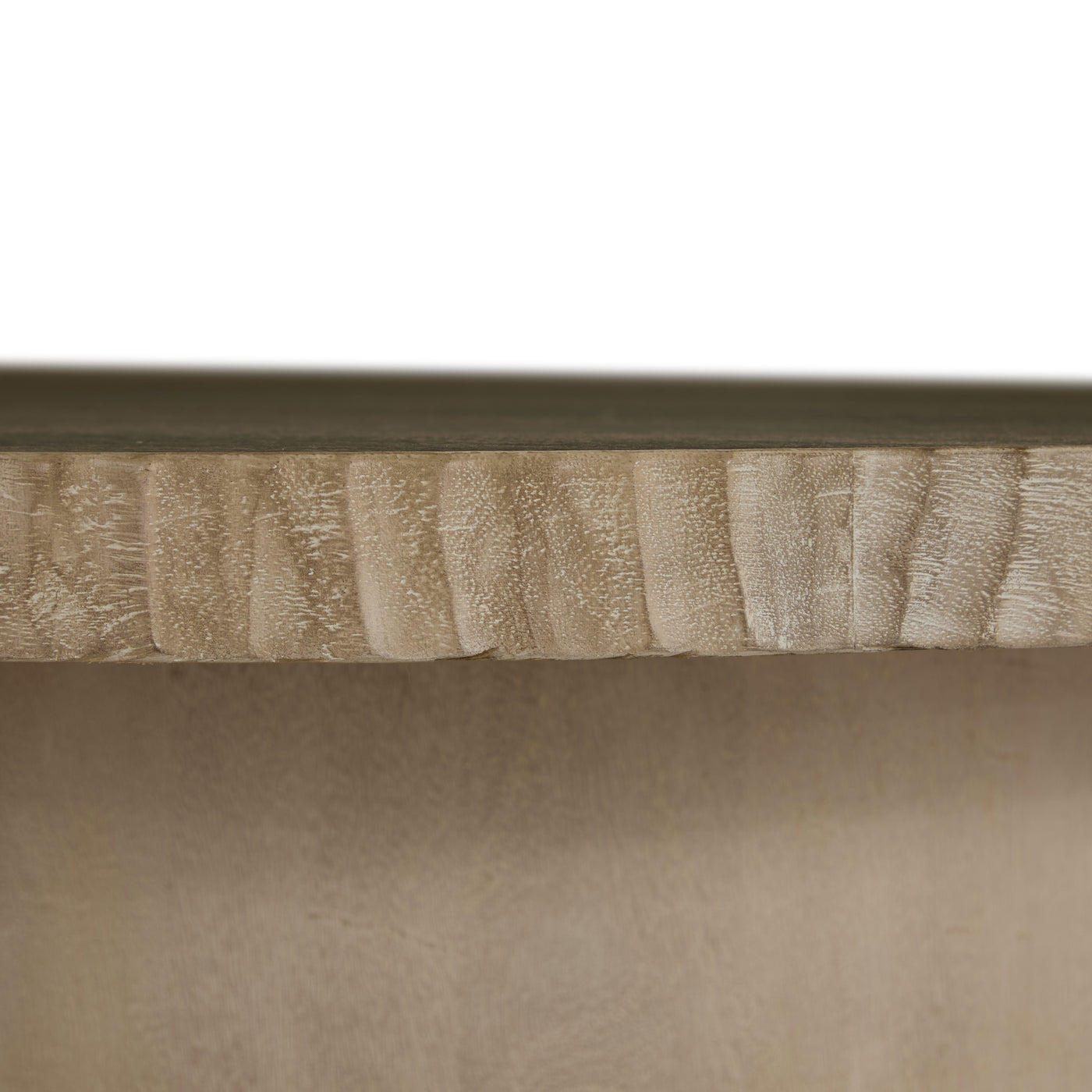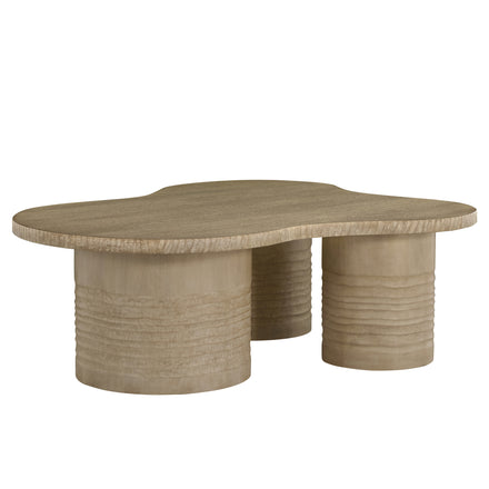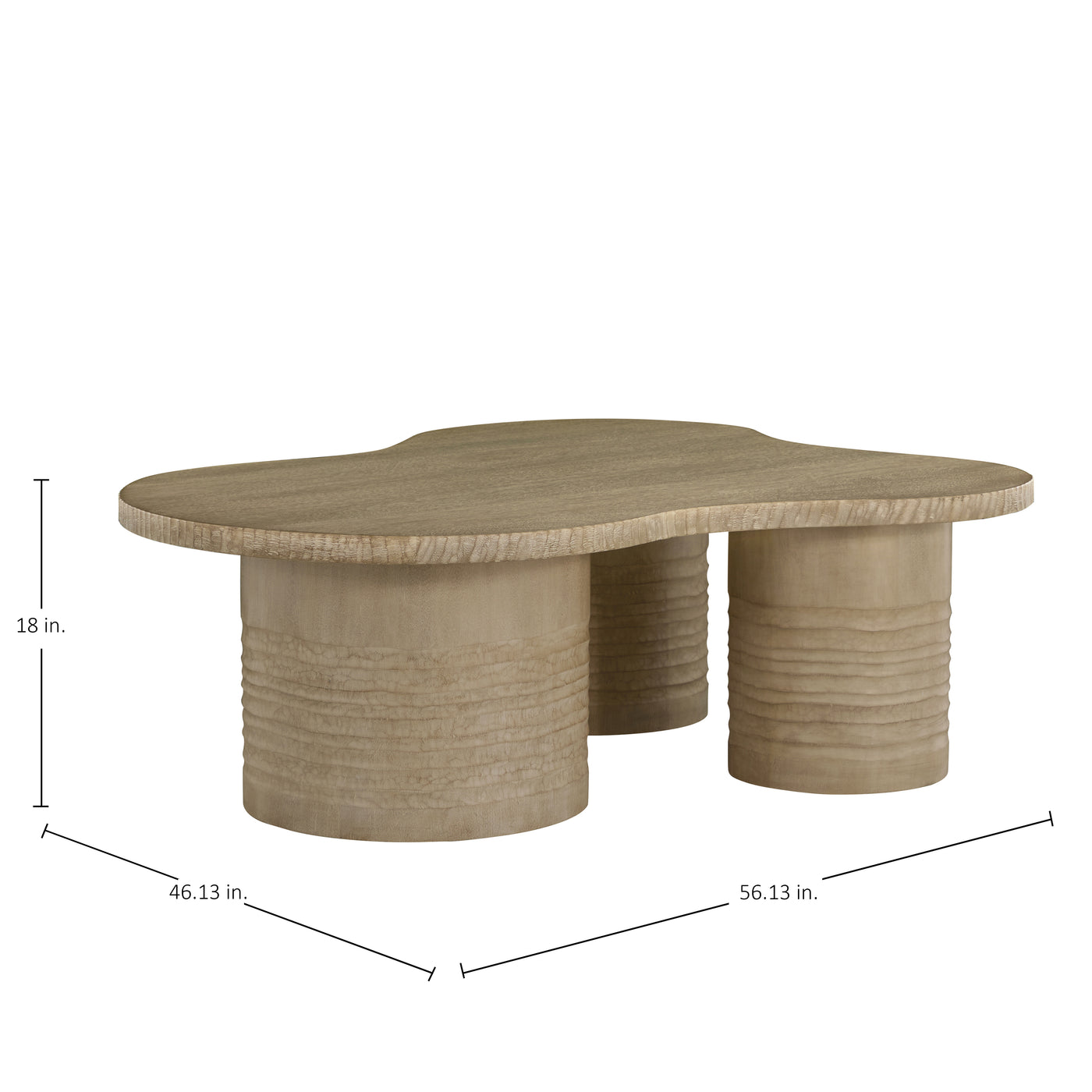 The Somara Coffee Table celebrates the beauty of organic form and hand craftsmanship. Made from solid mango wood in the light, natural Drift finish, this sculptural piece features a freeform tabletop supported by three cylindrical bases. Each element is intricately carved, showcasing visible chisel marks that give the surface a tactile, artisanal quality. The softly contoured edges and rippled texture create a sense of movement, evoking the feel of naturally eroded stone or weathered driftwood. Balancing artistry and function, the Somara Coffee Table makes a bold yet grounding statement—perfect for interiors that blend earthy authenticity with modern sophistication.