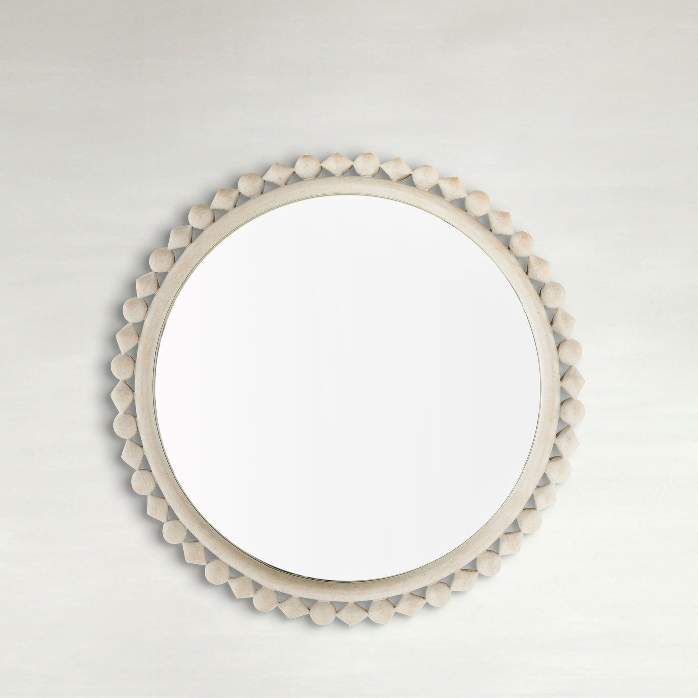 - Crafted with a circular wood frame in a distressed white finish for a soft, vintage-inspired touch
