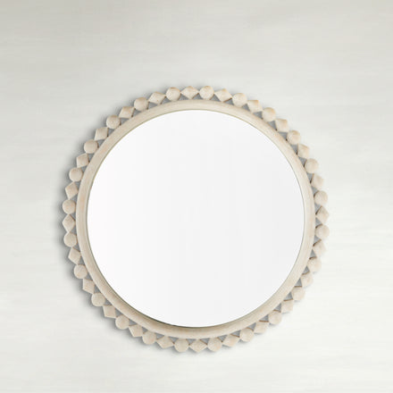 The Belle Mirror, at 28" round, brings a touch of charm and artistry to any wall. Its circular frame is finished in a distressed white, offering a subtle vintage feel, while the outer edge is adorned with an alternating pattern of diamond and circle shapes that create a unique and playful design. Perfect for adding a decorative accent in smaller spaces or complementing a gallery wall, the Belle Mirror blends classic elements with a modern, whimsical twist, making it an eye-catching addition to your home decor.