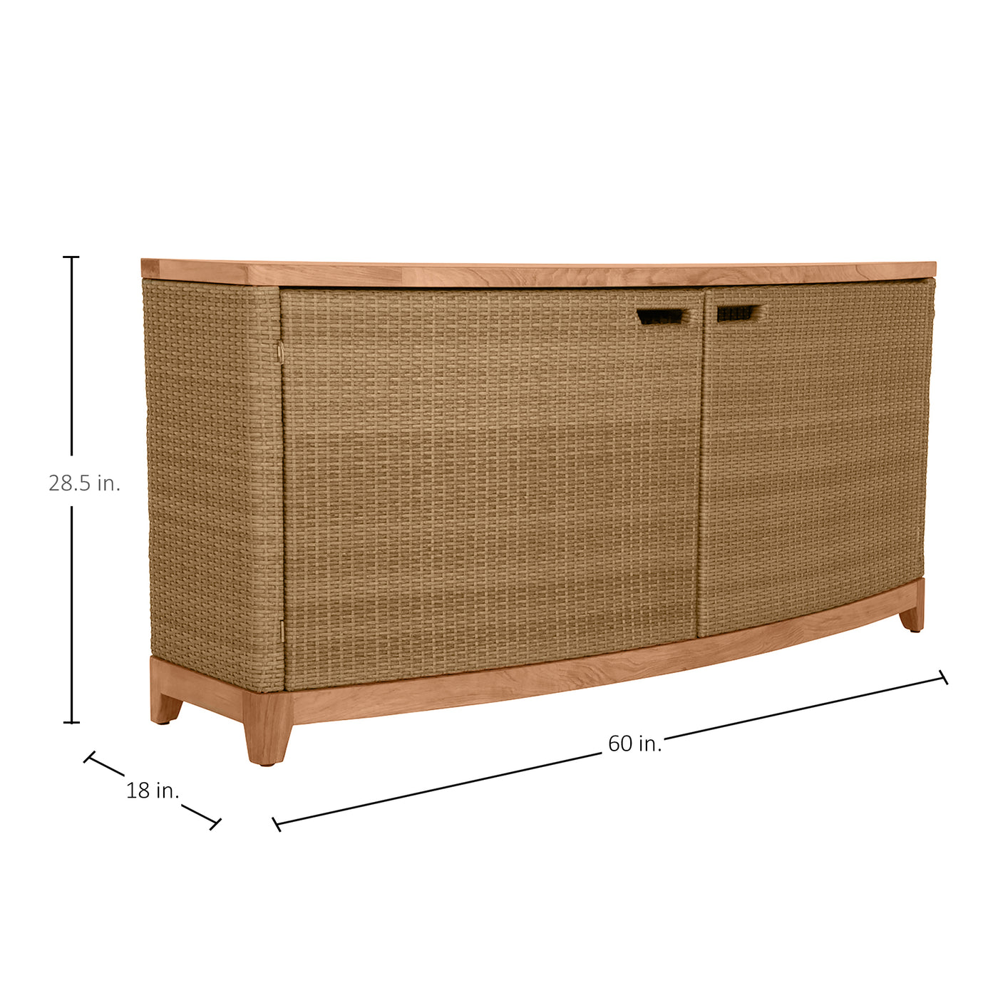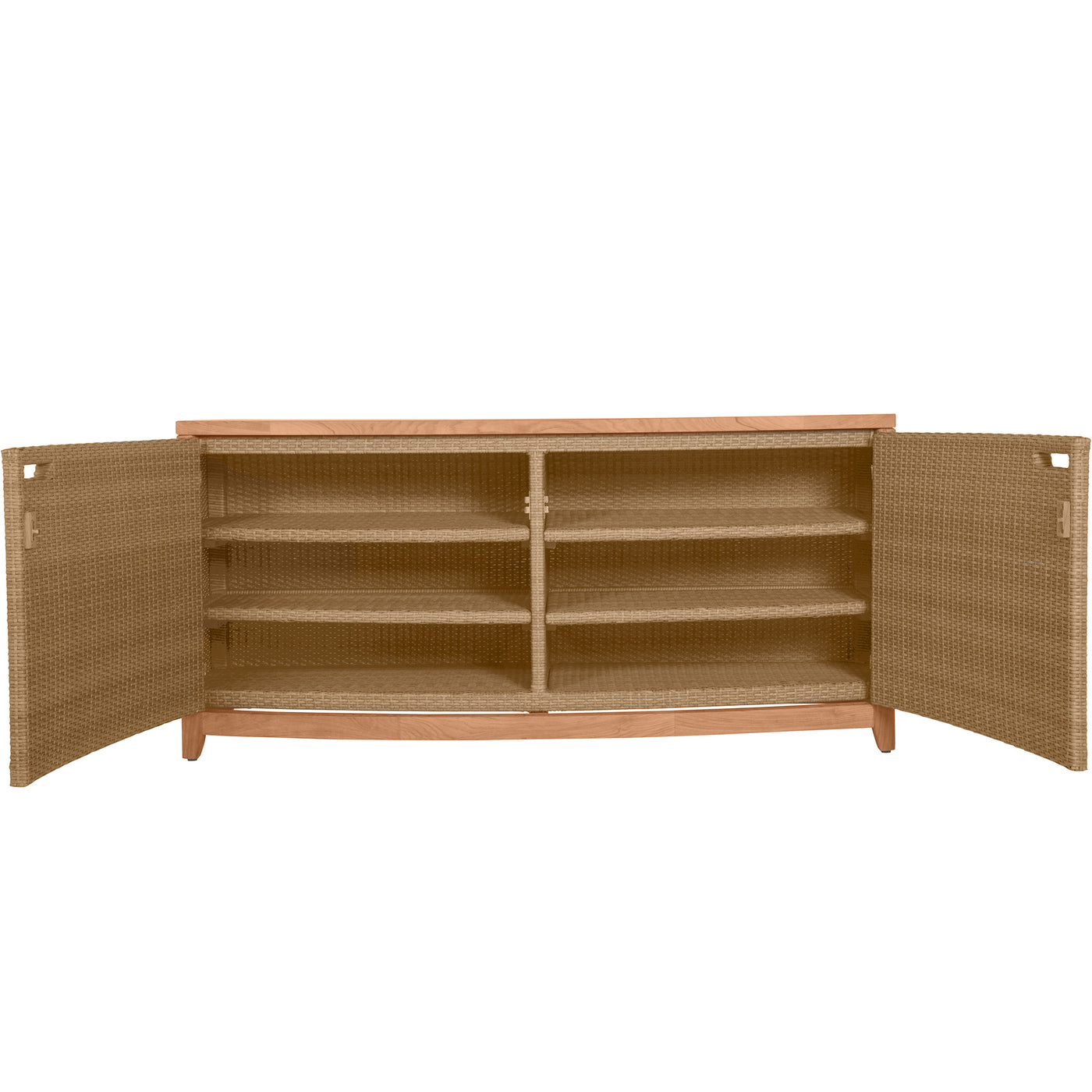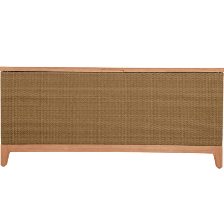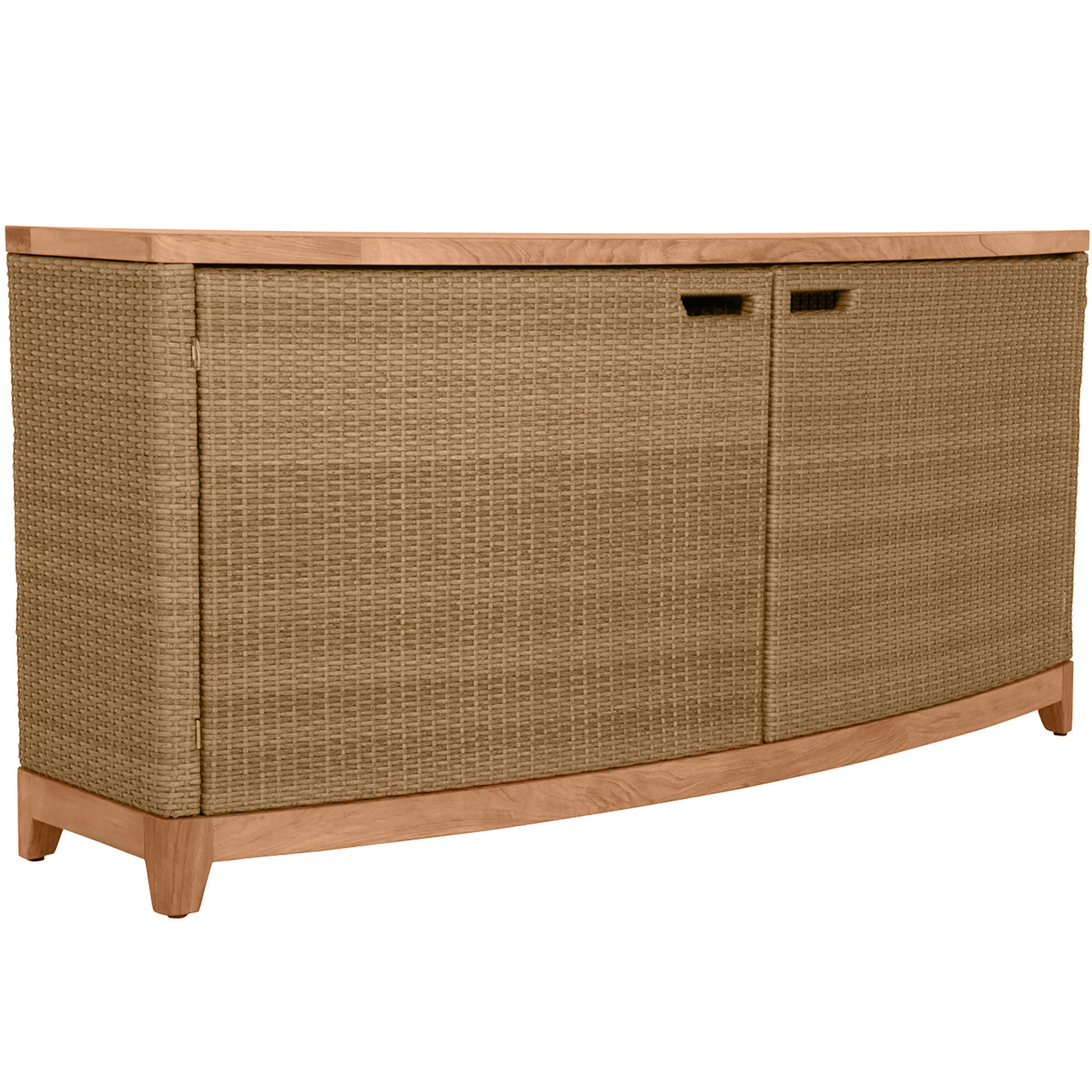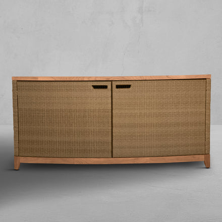 The Chesapeake Console Cabinet combines functionality with elegant design, making it an ideal storage solution to any outdoor living space. Crafted with a sturdy teak wood frame and our exclusive handwoven N-Dura™ resin wicker exterior, it offers a natural, elegant look that complements various outdoor decors. The curved design and clean lines enhance its visual appeal as well as the multi-tonal resin wicker. Inside, the cabinet features multiple shelves, offering ample storage space for outdoor essentials, such as cushions, garden tools, or dining accessories. The doors open wide, providing easy access to the contents while keeping everything neatly organized and out of sight. The top surface can also be used for display or as an additional serving area during gatherings. Durable and stylish, the Chesapeake Console Cabinet is designed to withstand outdoor elements, ensuring it remains a functional and attractive piece for years to come.