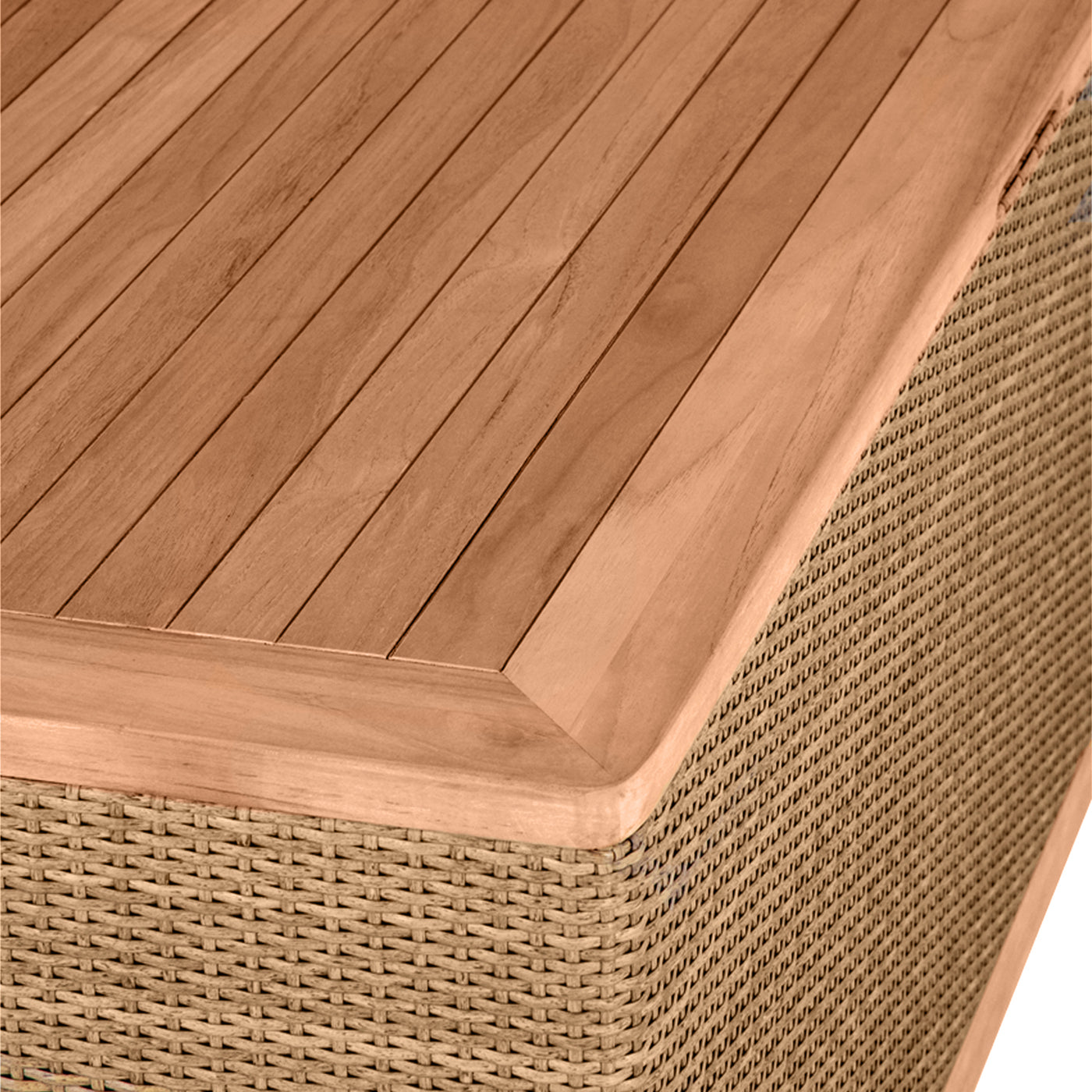 - Natural teak finish paired with raffia-style wicker and clean lines adds refined coastal charm to poolside settings
