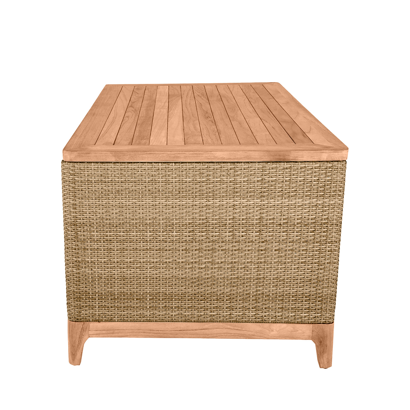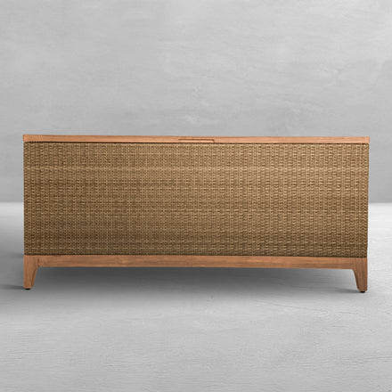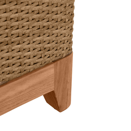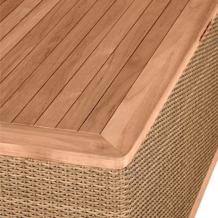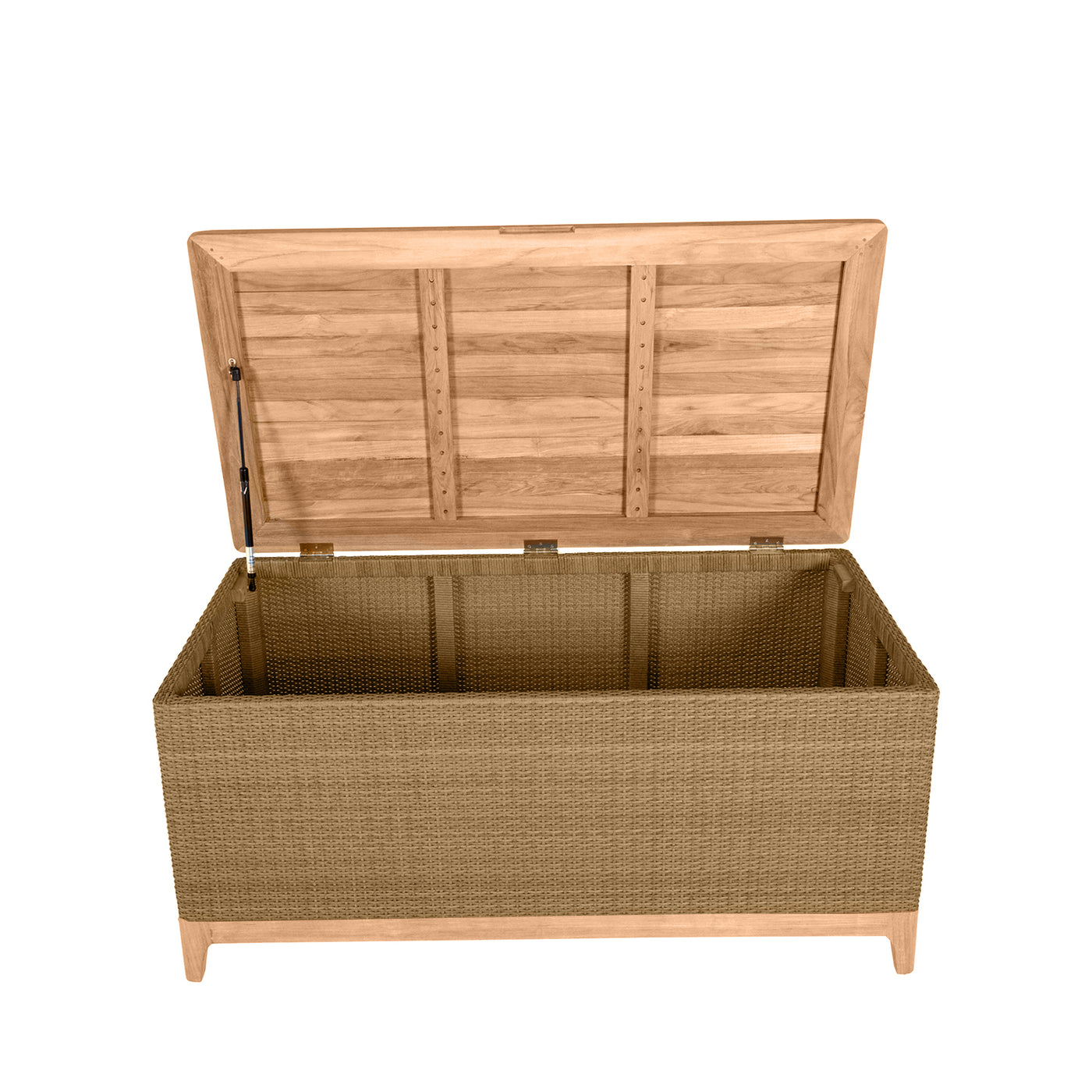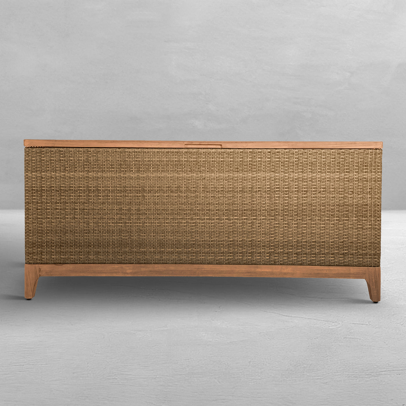 The Chesapeake Storage Box is a perfect blend of style and functionality, designed to enhance your outdoor living space. Crafted with a sturdy teak wood frame and our exclusive handwoven N-Dura™ resin wicker exterior, it offers a natural, elegant look that complements various outdoor decors. The slatted teak wood lid is not only aesthetically pleasing but also provides natural oils that repel water, making it highly resistant to moisture and preventing it from cracking or becoming brittle over time. These oils also protect the wood from insects and termites. This storage box is spacious, providing ample room to store outdoor cushions, pillows, and other essentials, keeping your patio neat and organized. Additionally, the interior features compartments and removable panels for organized storage. Its robust construction and elegant appearance ensure it will be a lasting and attractive solution for your outdoor storage needs.