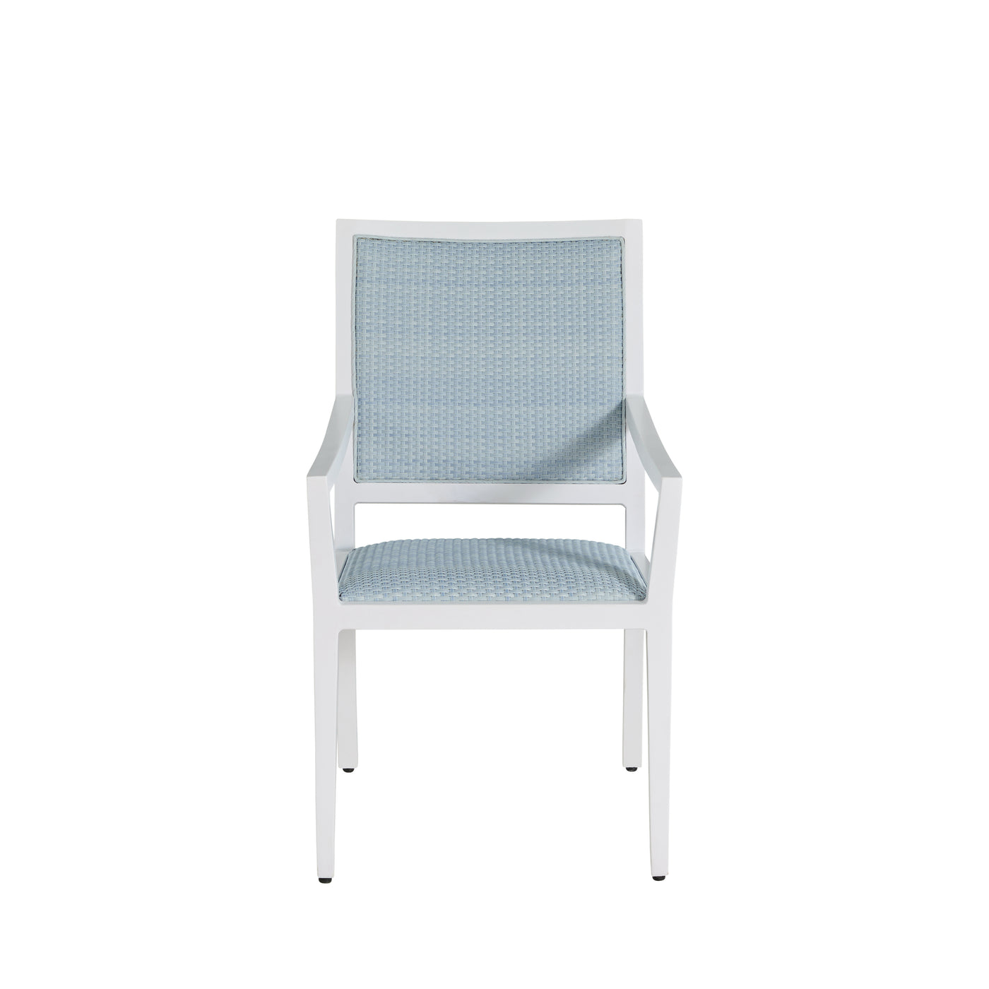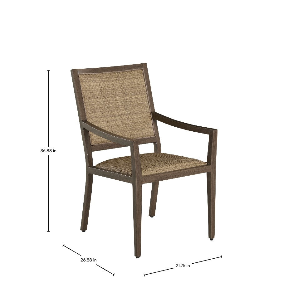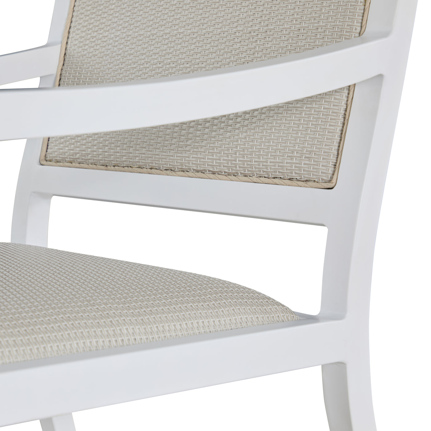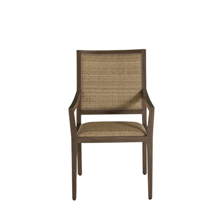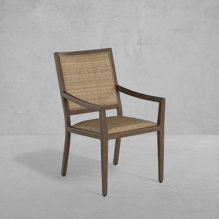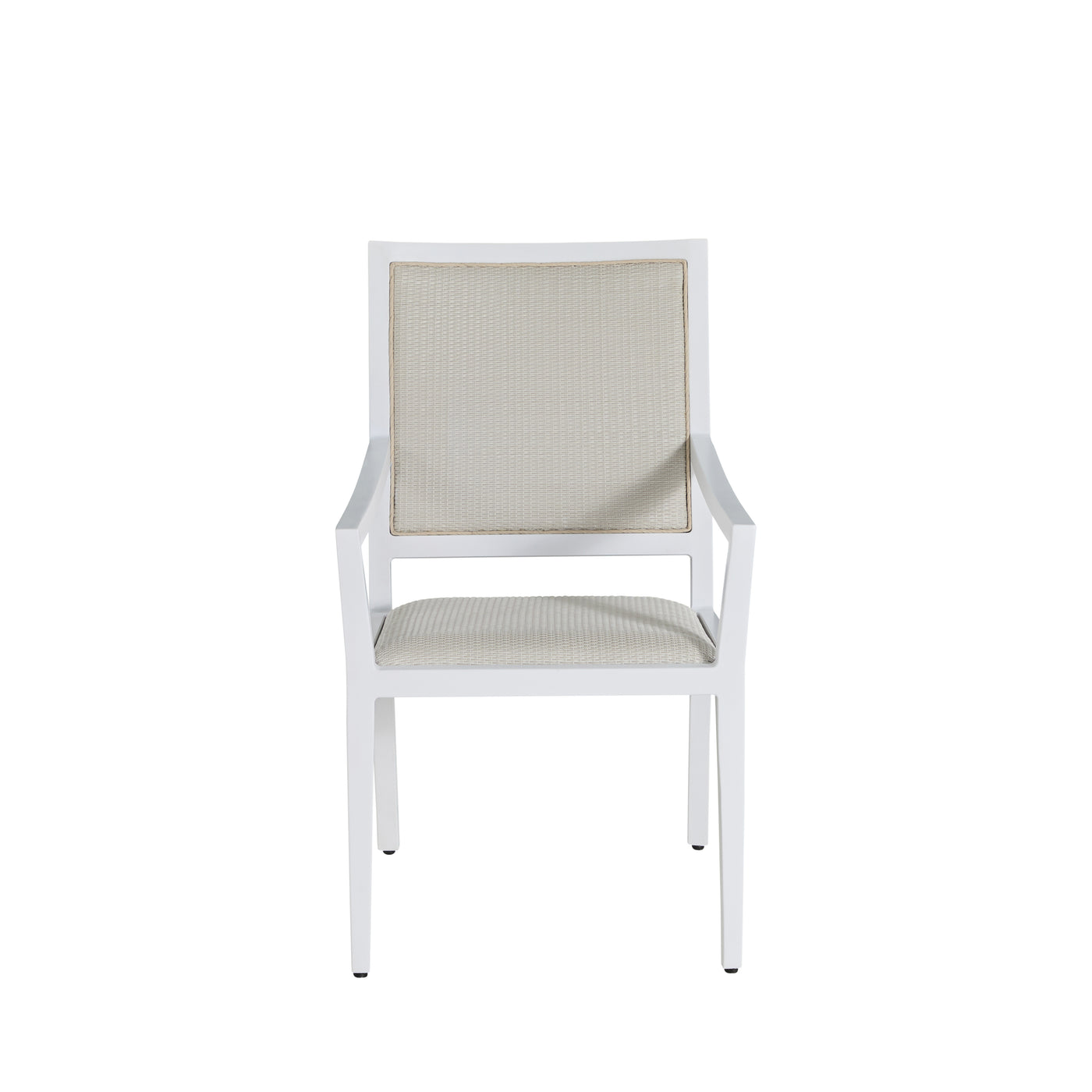The Grand Bermuda Arm Chair features an exceptionally weather-resistant woven seat and back crafted from N-Dura™ resin wicker for long-lasting beauty and durability. The hand-welded wrought aluminum frame highlights the slight ergonomical slope of the armrests and straight modern lines of the legs. Featuring a versatile design, this dining chair pairs with many of our different outdoor dining tables, as well as other collections. The seating is made with reticulated foam, making this interior cushioned seat comfortable for the alfresco meals.