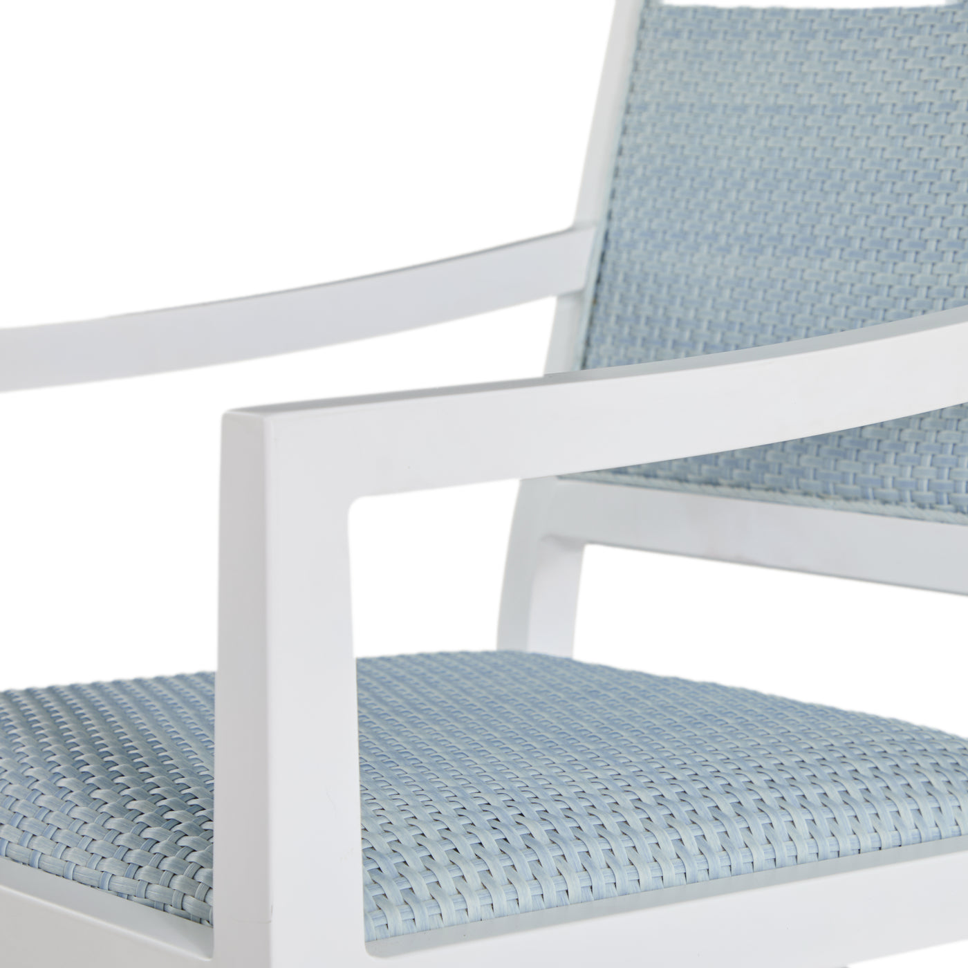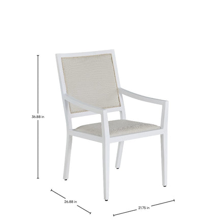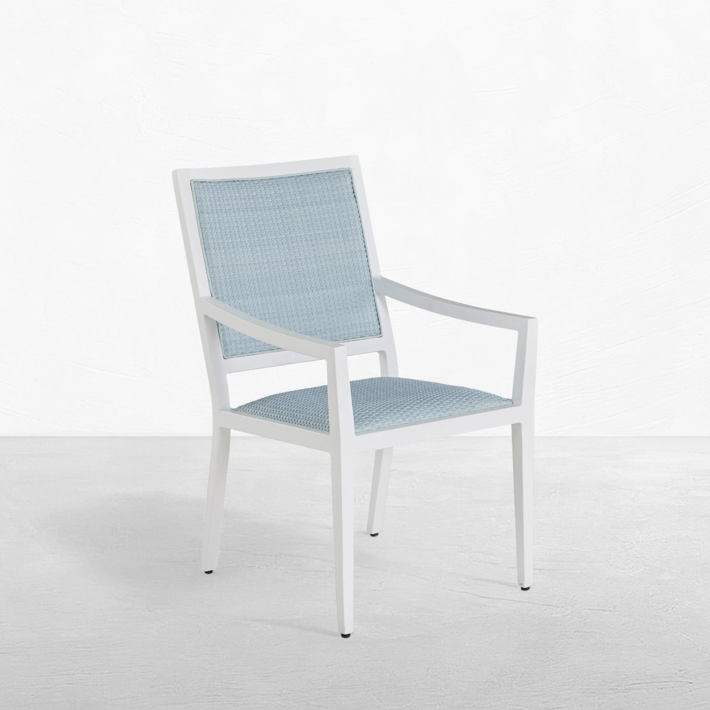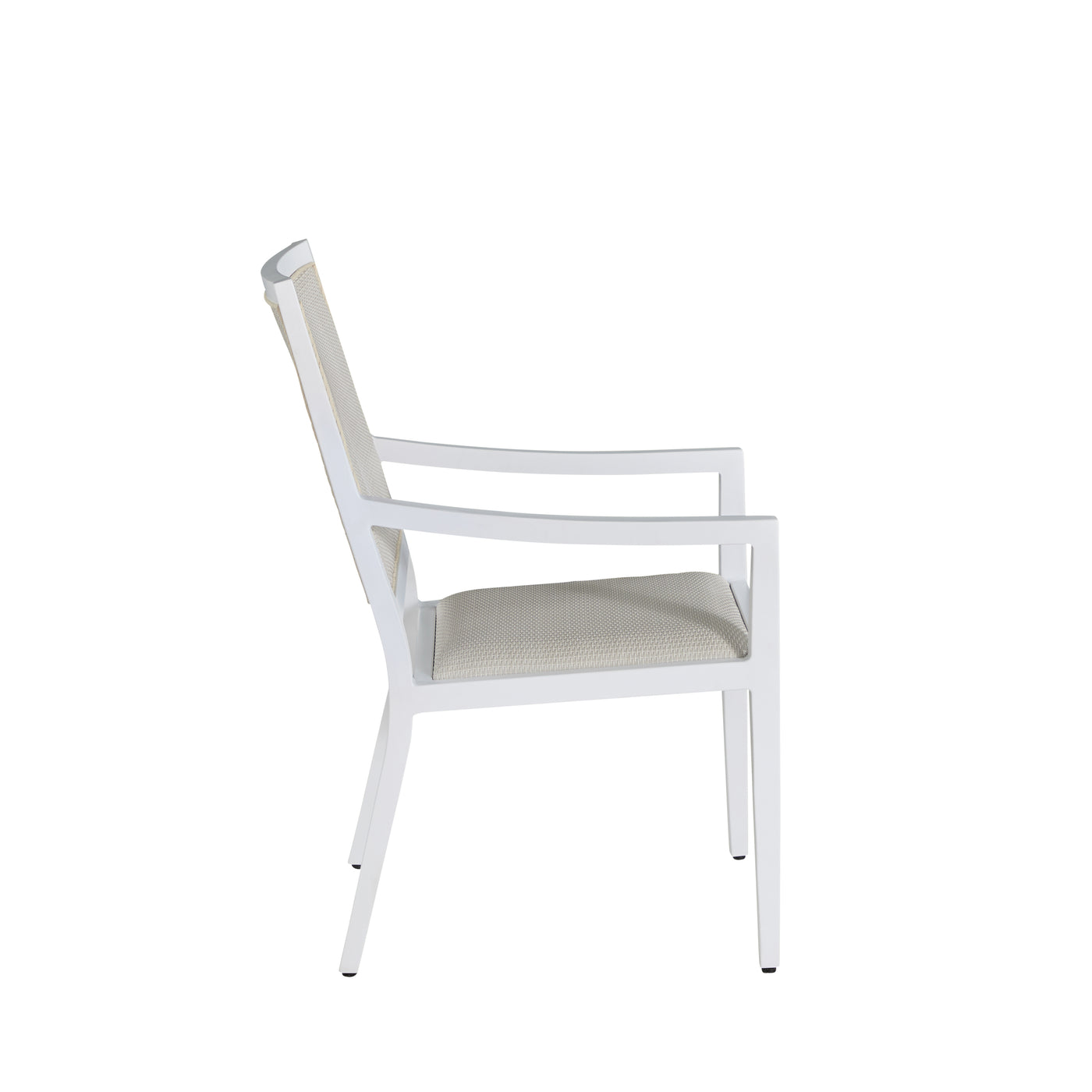 The Grand Bermuda Arm Chair features an exceptionally weather-resistant woven seat and back crafted from N-Dura™ resin wicker for long-lasting beauty and durability. The hand-welded wrought aluminum frame highlights the slight ergonomical slope of the armrests and straight modern lines of the legs. Featuring a versatile design, this dining chair pairs with many of our different outdoor dining tables, as well as other collections. The seating is made with reticulated foam, making this interior cushioned seat comfortable for the alfresco meals.