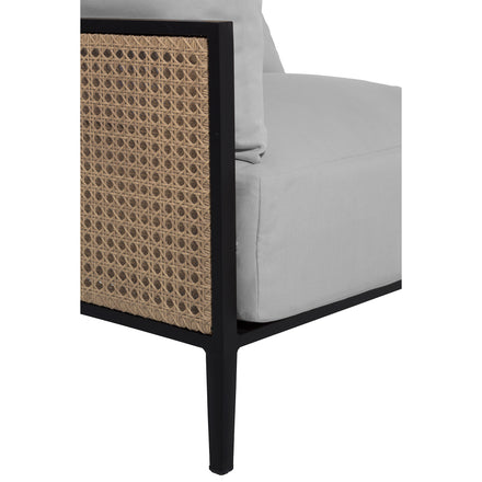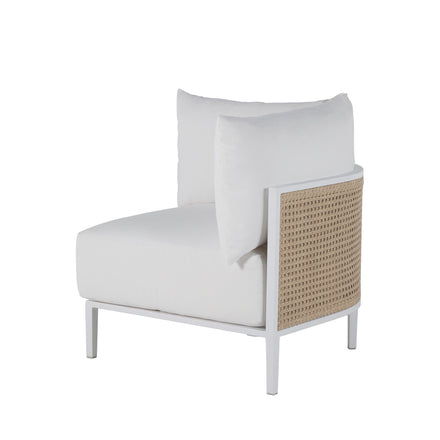 The Havana Corner Piece is a seamless fusion of functionality and style, meticulously designed to transition your outdoor area into a luxurious lounge space. This piece features a gently curved wrought aluminum frame that embodies the spirit of mid-century modern design, while the all-weather, natural handwoven N-Duraâ„¢ resin wicker recalls the open cane weaving characteristic of old Havana. Its crisp lines and modern silhouette, coupled with plush cushions and either the Havana Left Arm Facing Loveseat or Right Arm Facing Loveseat provides a cohesive and sophisticated sectional that invites comfort and conversation.
