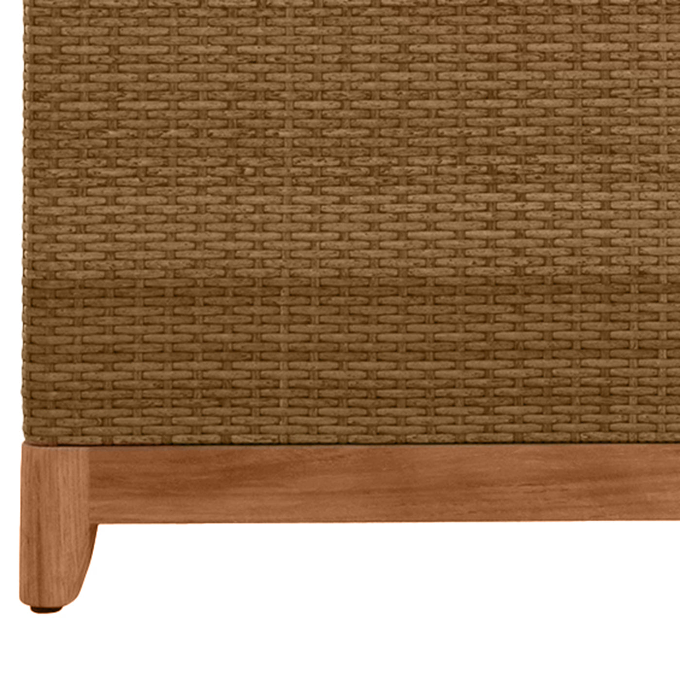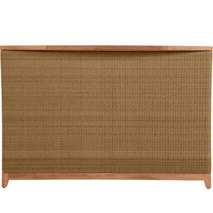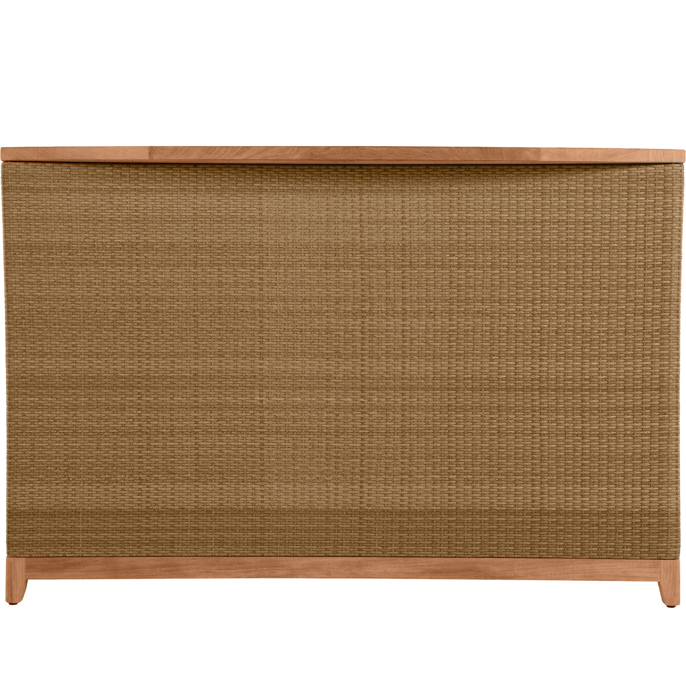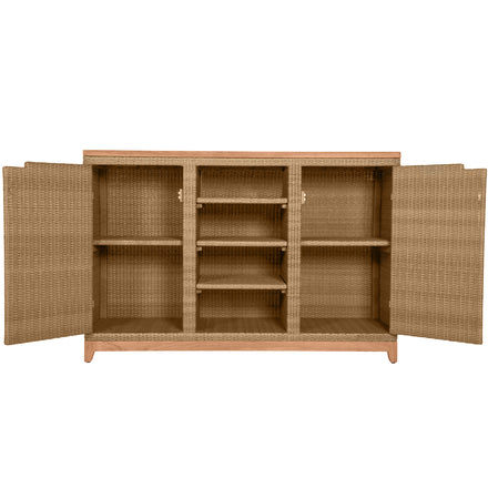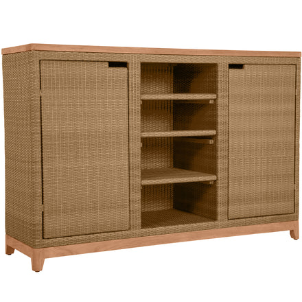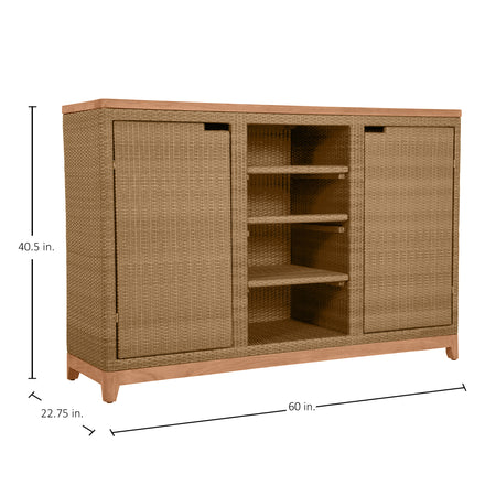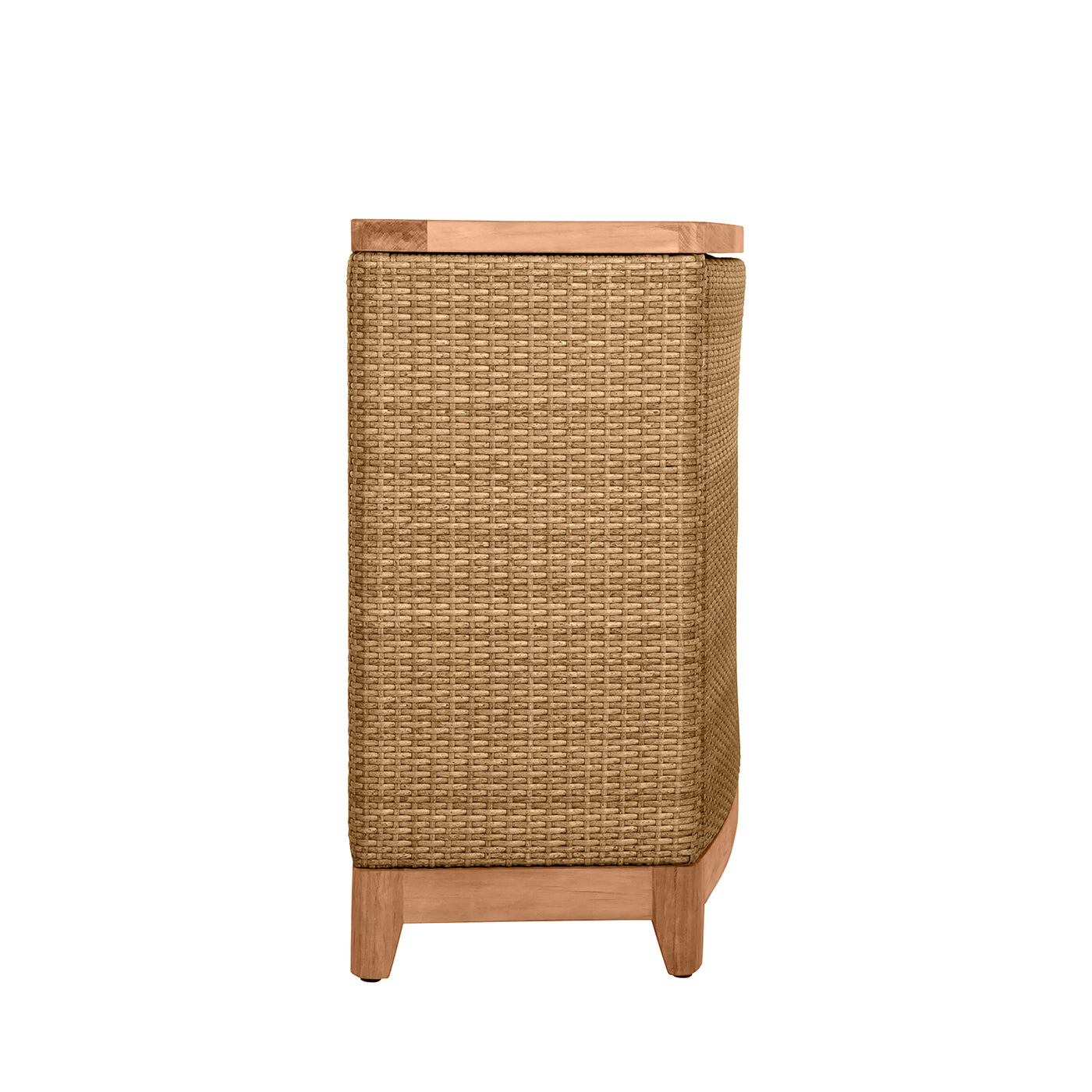 The Chesapeake Buffet Storage Table is a perfect blend of style and practicality, making it an ideal storage solution to any outdoor living space. Crafted with a sturdy teak wood frame and our exclusive handwoven N-Dura™ resin wicker exterior, it offers a natural, elegant look that complements various outdoor decors. The curved design and clean lines enhance its visual appeal as well as the multi-tonal resin wicker.Featuring two spacious enclosued side cabinets and an open center section with adjustable shelves, the Chesapeake Buffet Storage Table offers ample storage for your outdoor essentials, such as tableware, utensils, or decorative items. The teak table top is ideal for serving food and drinks during gatherings, making it a versatile addition to your patio or garden. The combination of high-quality materials and thoughtful design ensures that it is not only functional but also a stylish focal point in any outdoor setting.
