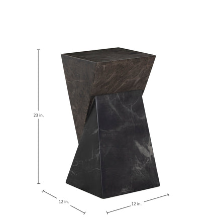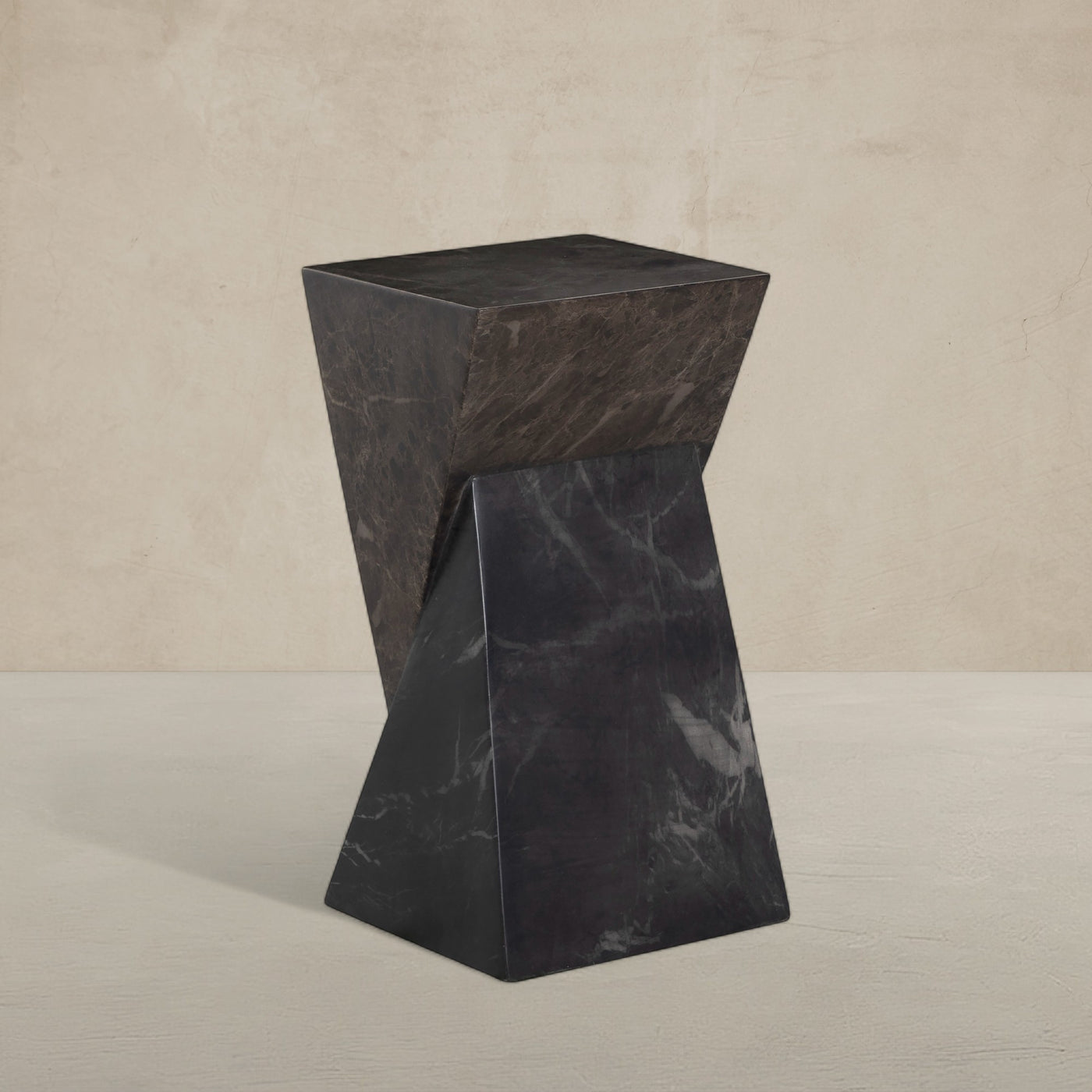 The Aldric Drink Table makes a bold architectural statement through its sculpted form and contrasting tones. It features our Dark Imperial and Nero Marquina finishes, creating a dramatic interplay of depth and texture, while fully welcoming the natural veins of the stone. Its angular silhouette adds dynamic movement while maintaining balance and stability. Compact yet impactful, this table is perfect beside a lounge chair, sofa, or as an accent in a refined living space. The Aldric brings together natural stone artistry and geometric precision for a sophisticated modern edge.