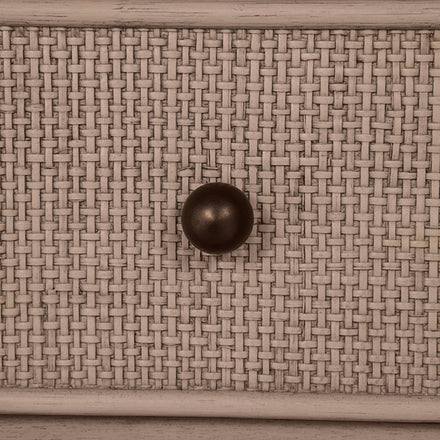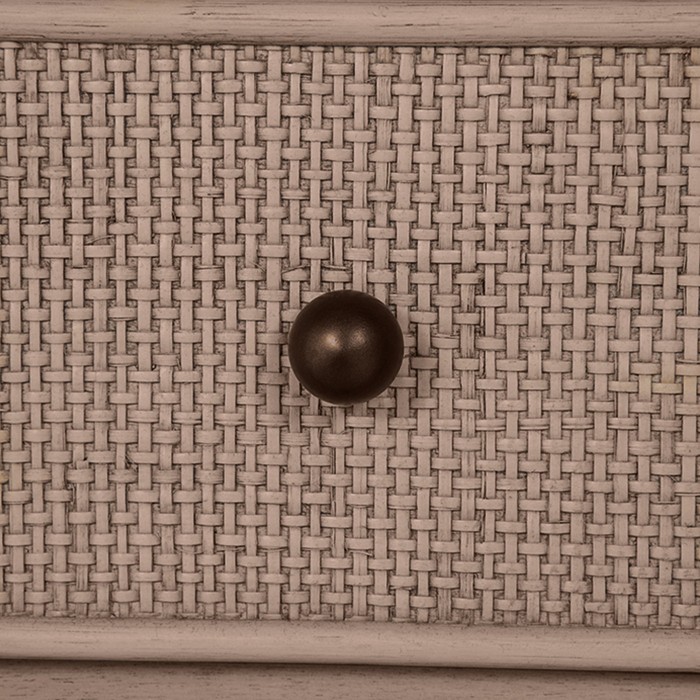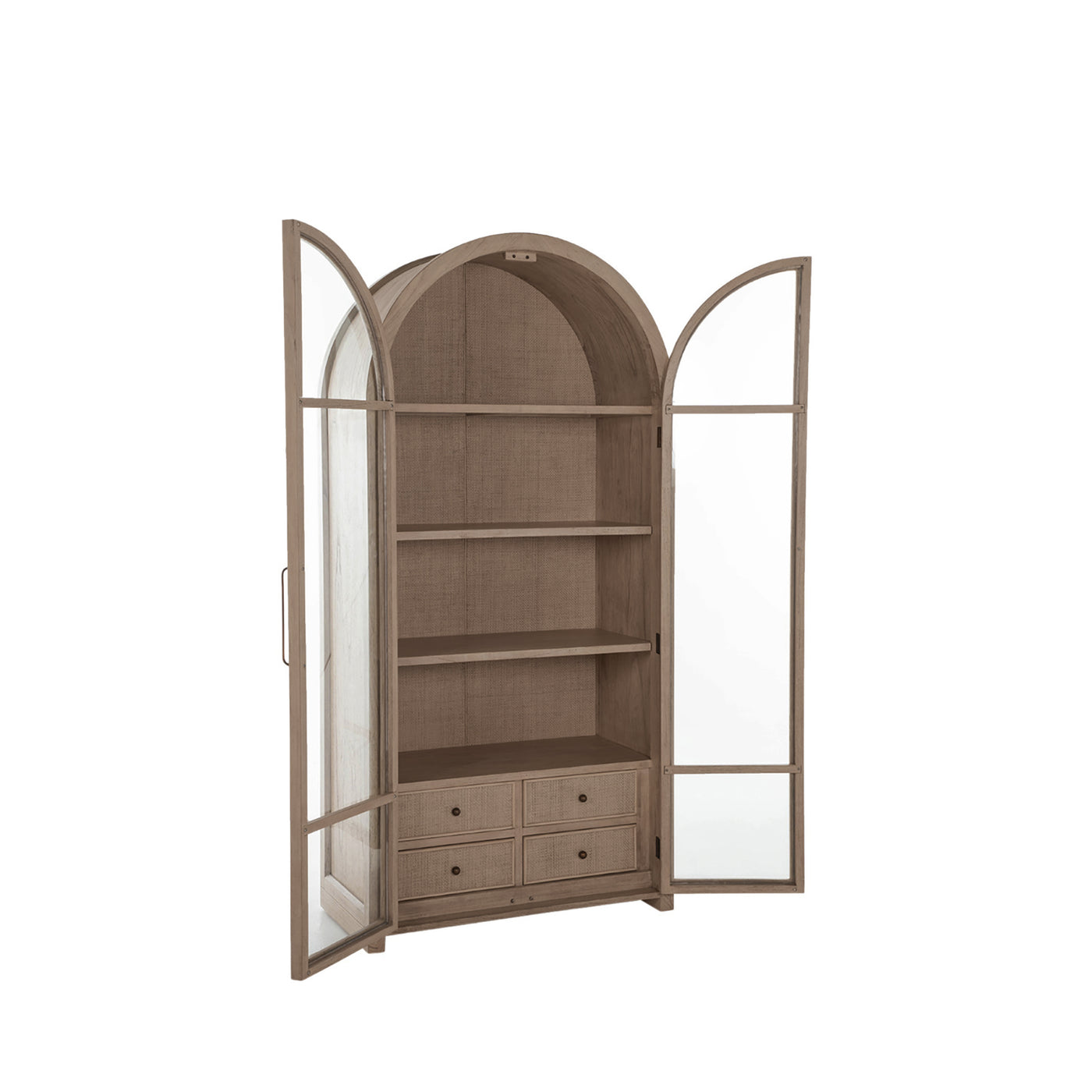 The Elsa Cabinet combines the romantic allure of classic design with the functionality of modern furniture. Its neutral tones and arched top exude a sense of European elegance and versatility in styling, while the woven texture on the backside of the cabinet and on the drawers adds depth and interest, creating a tactile experience. Its aesthetic is soft and inviting, making it a delightful addition to any room looking to balance beauty and practicality. The Elsa Cabinet is perfect for showcasing fine china, storing a collection of books, or organizing linens essentials.