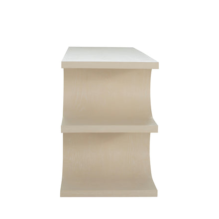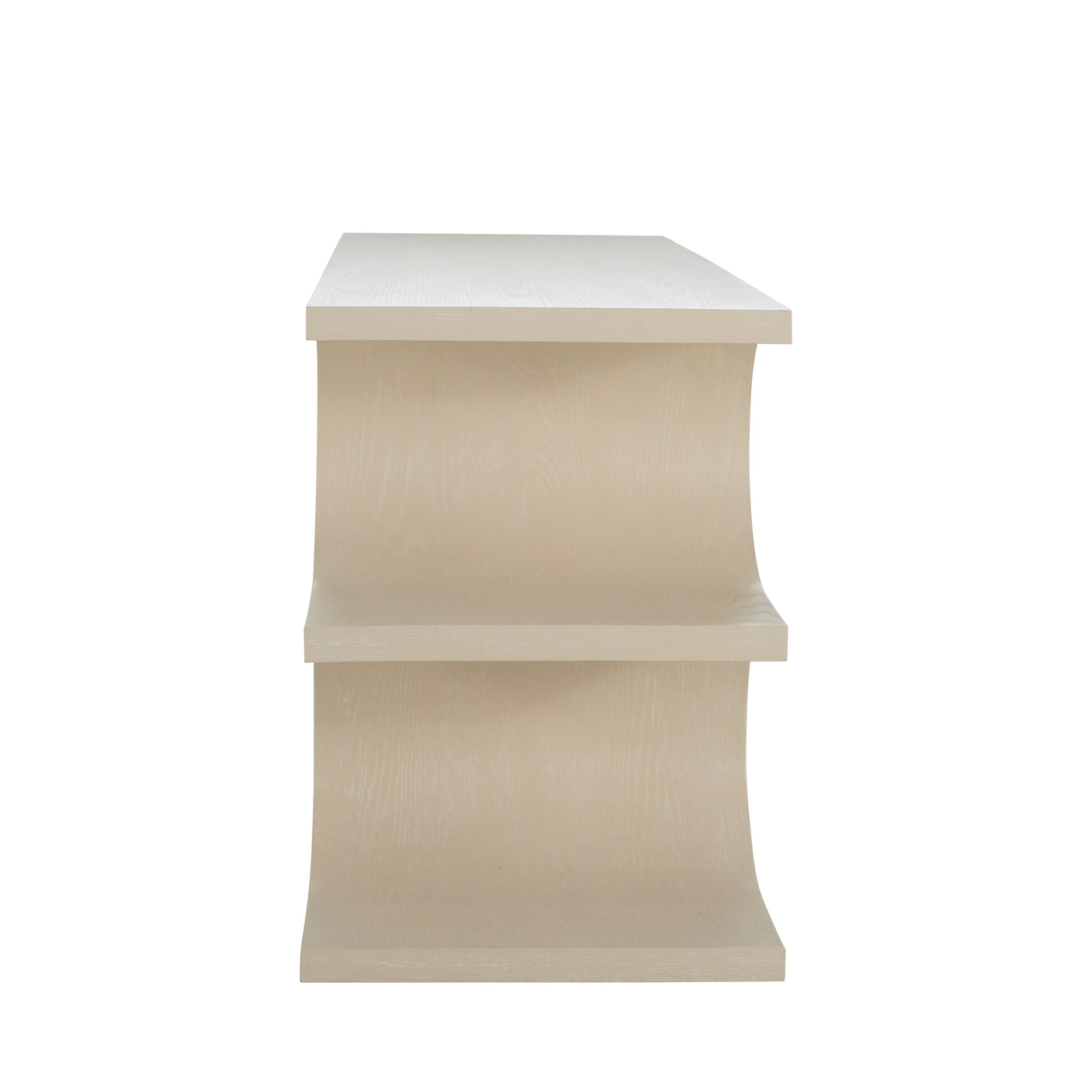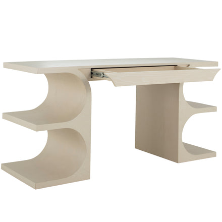 The Erin Desk showcases artistic flair and sculptural grace with modern functionality. The desk's standout feature is its unique base, which consists of gracefully curved legs that form a visually appealing silhouette, with thoughtfully added shelves. The top surface is sleek and spacious, covered in an oak veneer, providing ample room for work or display, while a discreet drawer offers convenient storage for office essentials. Finished in a cerused white, the desk highlights the natural grain and texture. This combination of functional design and artistic elements makes the desk a versatile and attractive choice for any setting.