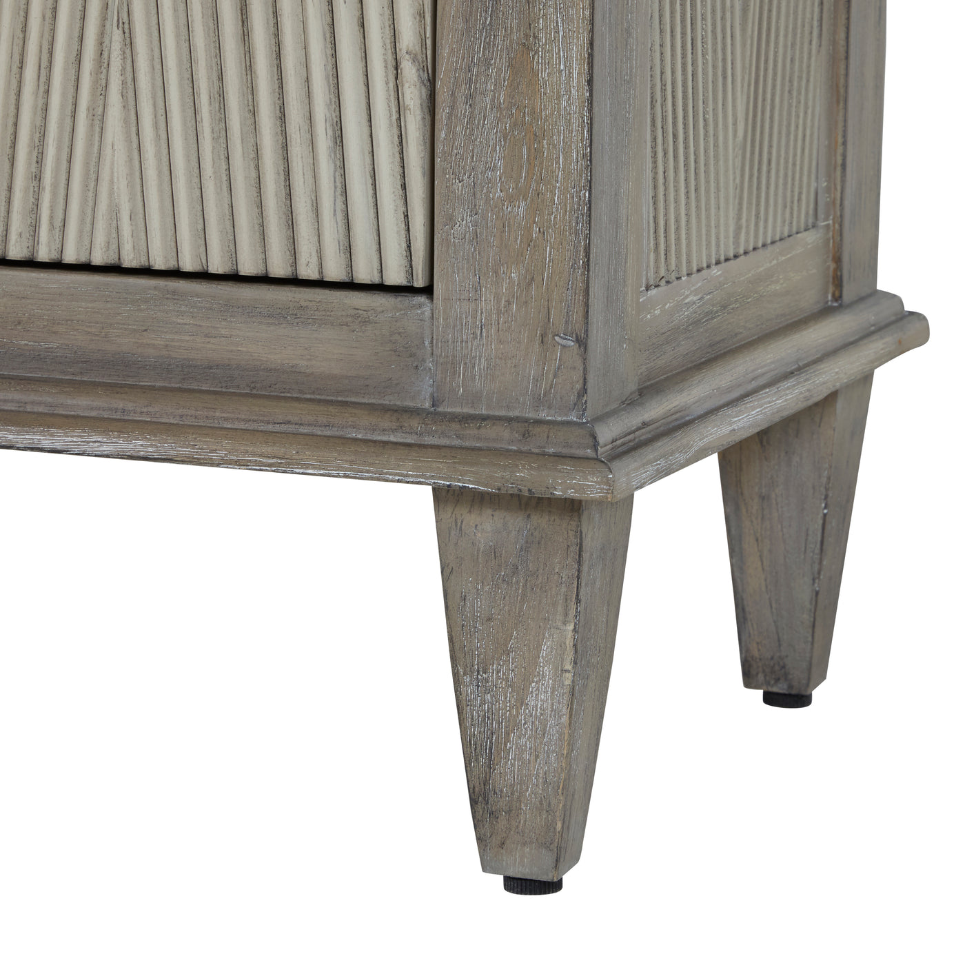 The Isaac Long Cabinet combines slim design with classic style, featuring a Mindy wood construction with a brushed gray and sesame white finish, highlighted by antique bronze accents. Its unique ribbed V-pattern doors offer visual intrigue, while the slim 14" depth makes it a perfect fit for tight spaces. Ideal for stowing away clutter or organizing essentials, it brings functional elegance to any room without occupying too much space.