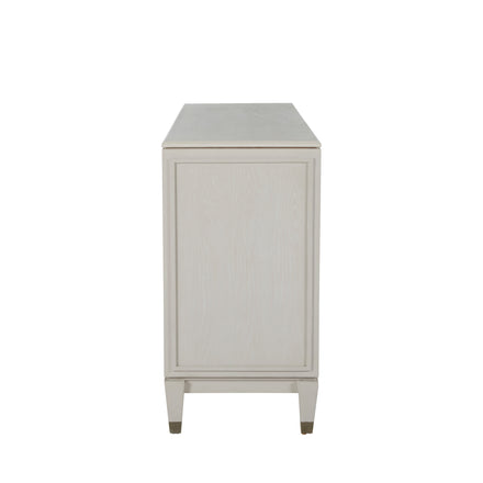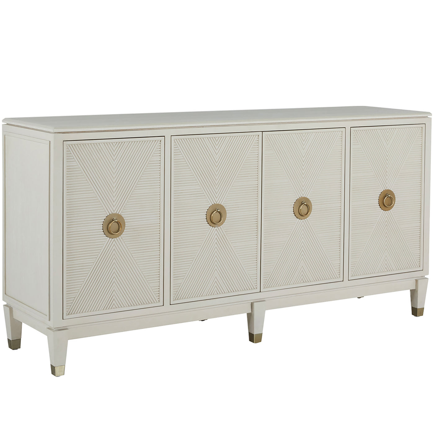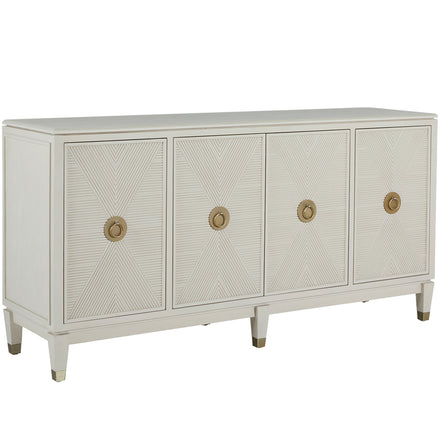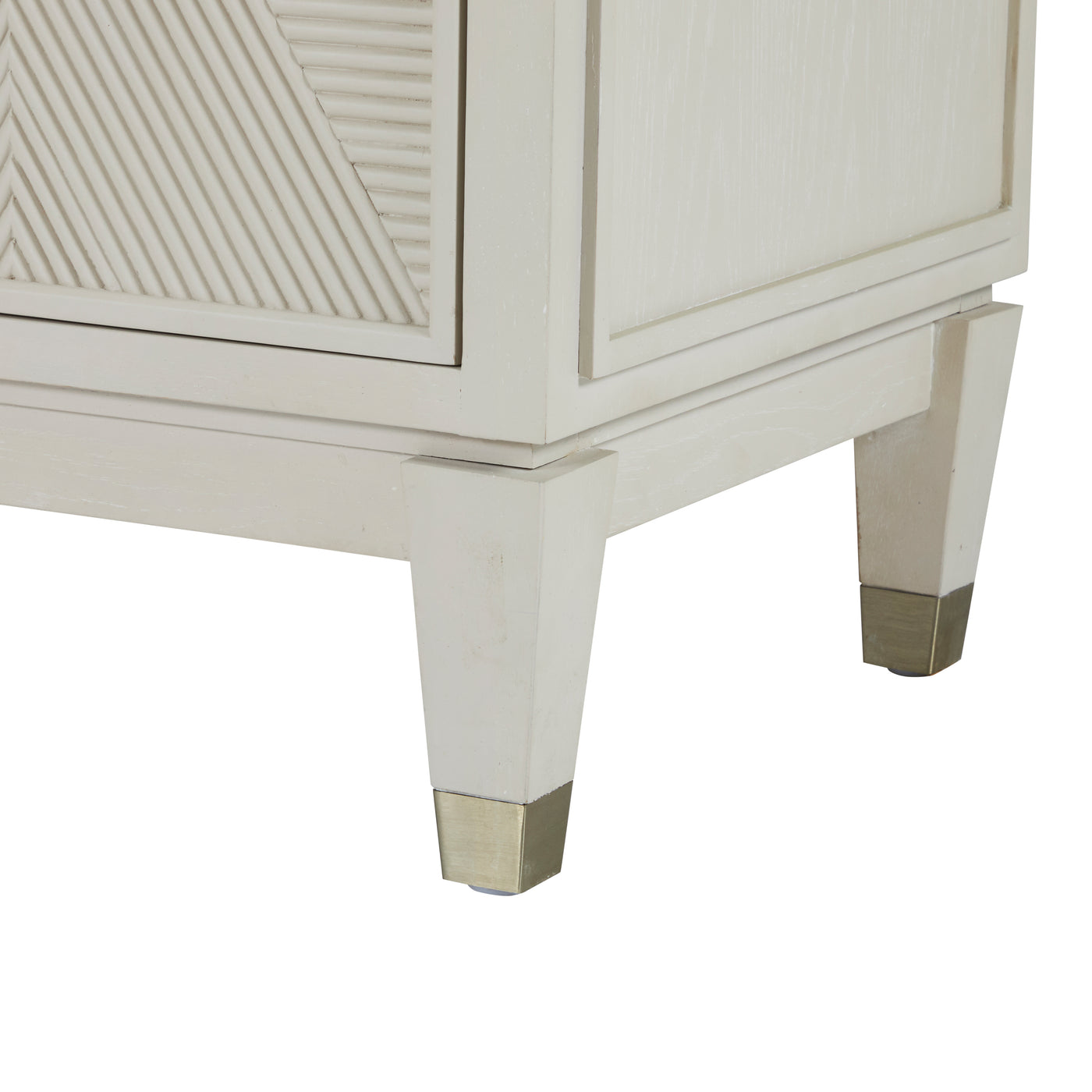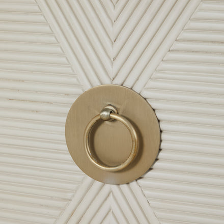 The Strella Cabinet stands as a paragon of transitional design, masterfully bridging classic elegance with contemporary flair. At first glance, the cabinet's cerused white finish and ribbed door texturing invite a unique texture, hinting at meticulous craftsmanship. The converging lines across the facade, accented by champagne-toned ring pulls, add a geometric dynamism that captures the eye and stimulates interest. Whether housing fine dinnerware or acting as the central hub for your multimedia, the Strella provides both functionality and a touch of luxury, making it an invaluable addition to your décor collection.