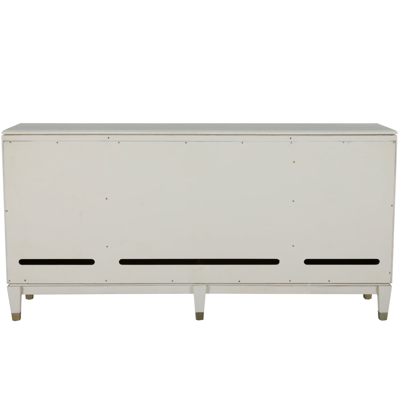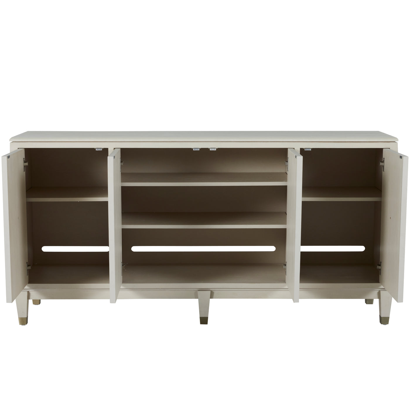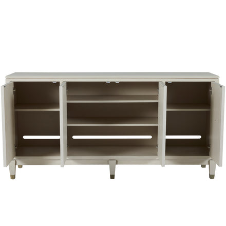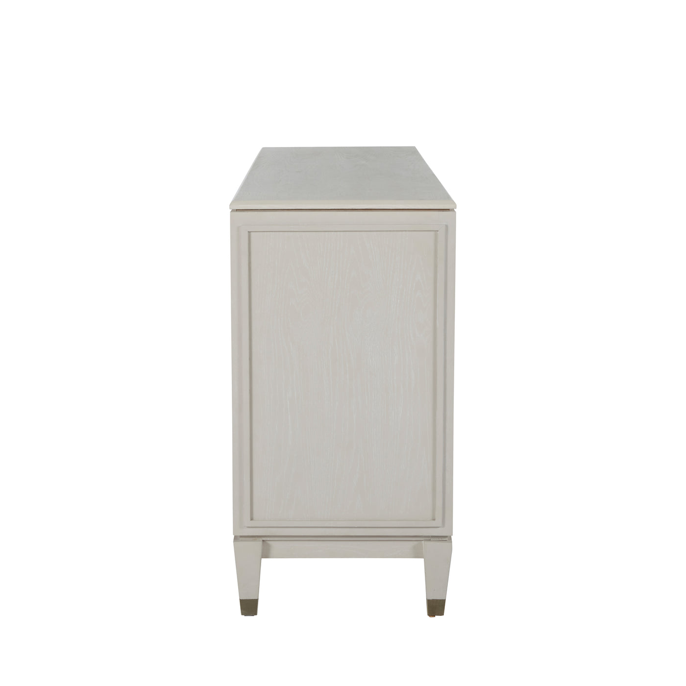 The Strella Cabinet stands as a paragon of transitional design, masterfully bridging classic elegance with contemporary flair. At first glance, the cabinet's cerused white finish and ribbed door texturing invite a unique texture, hinting at meticulous craftsmanship. The converging lines across the facade, accented by champagne-toned ring pulls, add a geometric dynamism that captures the eye and stimulates interest. Whether housing fine dinnerware or acting as the central hub for your multimedia, the Strella provides both functionality and a touch of luxury, making it an invaluable addition to your décor collection.