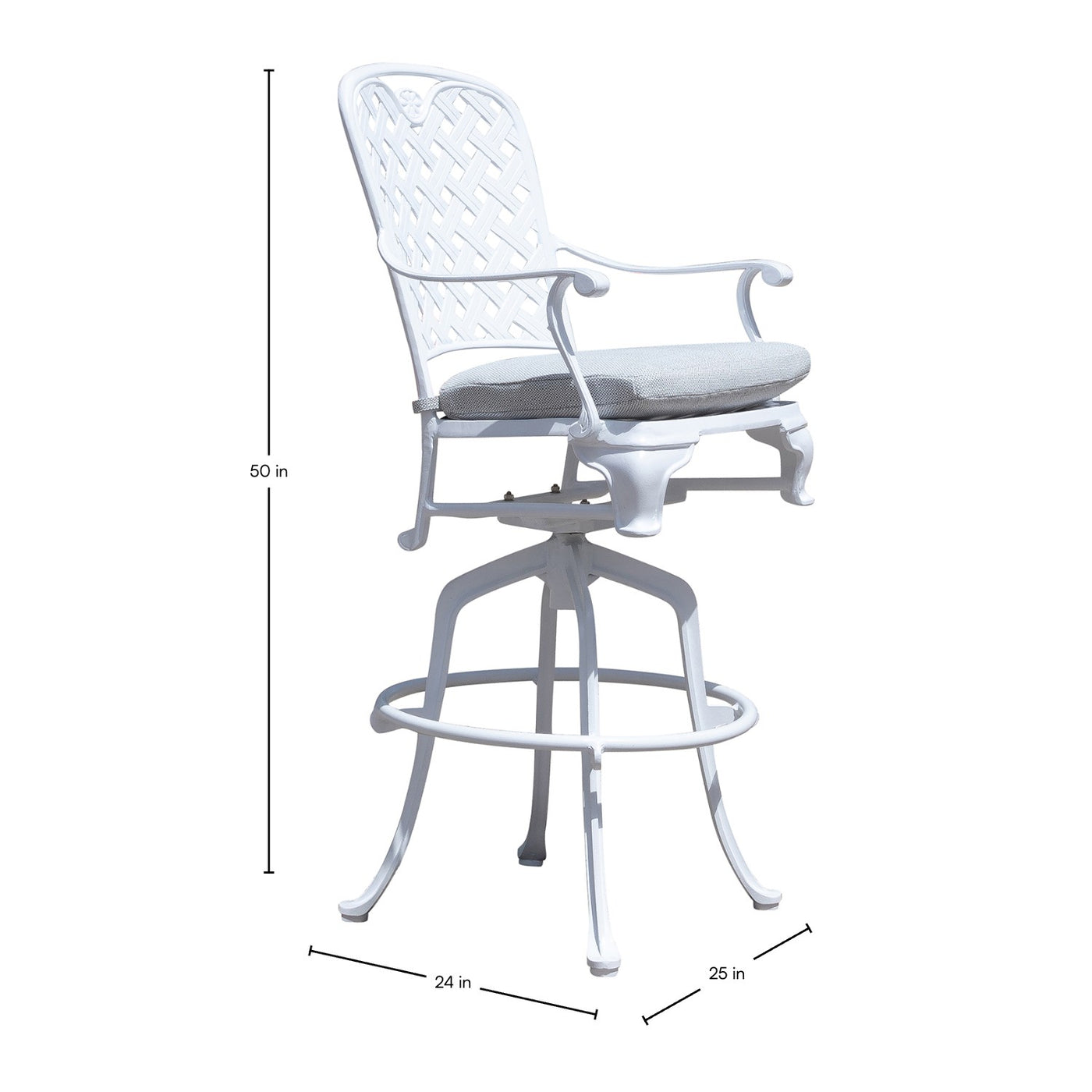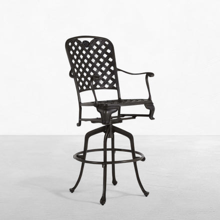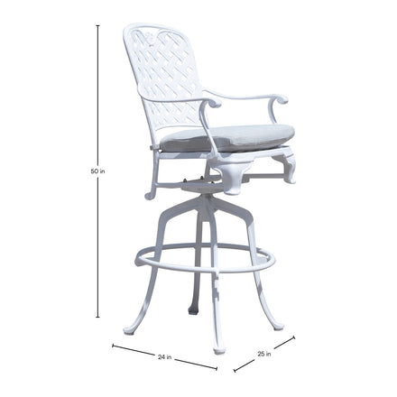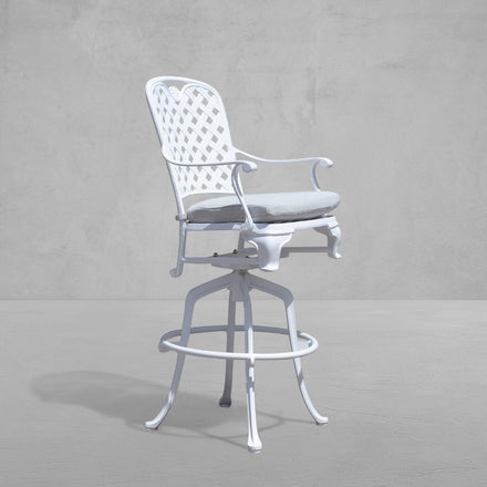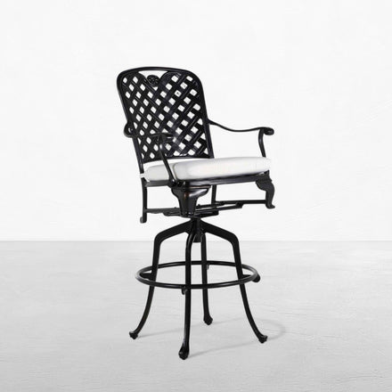 The Provance 30" Swivel Bar Stool evokes the relaxed elegance of the South of France. It features a double latticework design, scooped high back, and never-rust cast aluminum construction that is finished in an architectural-grade powder coating that is exceptionally weather resistant. This gracefully styled seat mixes well with a variety of metal patio sets and features a relaxing swivel motion. This item is designed to be enjoyed either with or without a cushion. Please designate your choice in the below "Select a Cushion" dropdown.