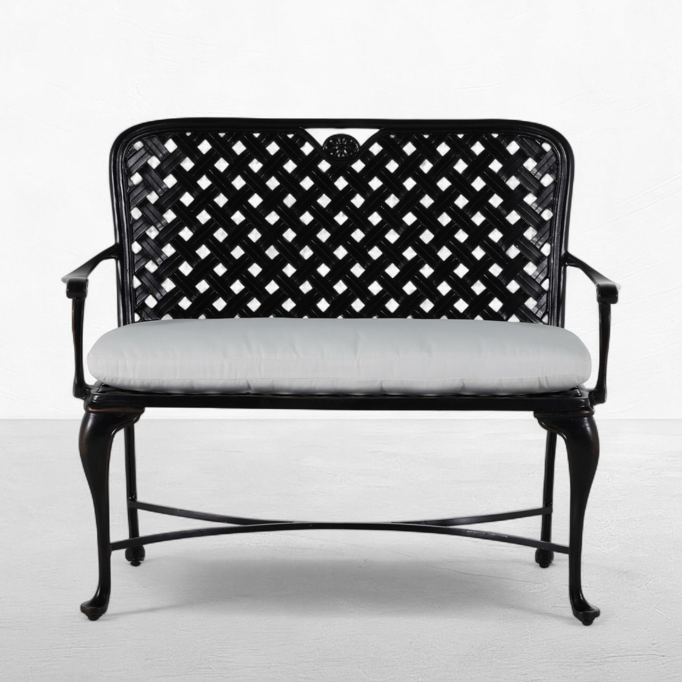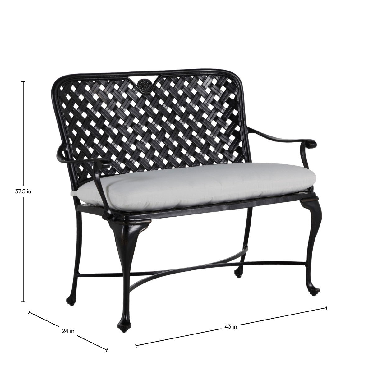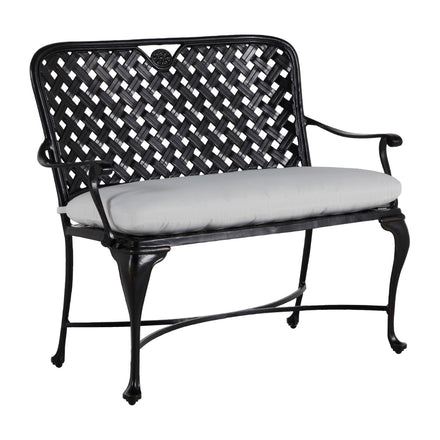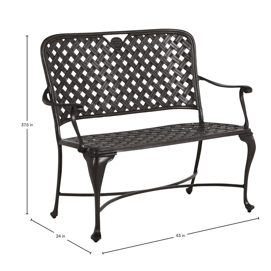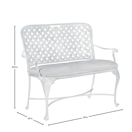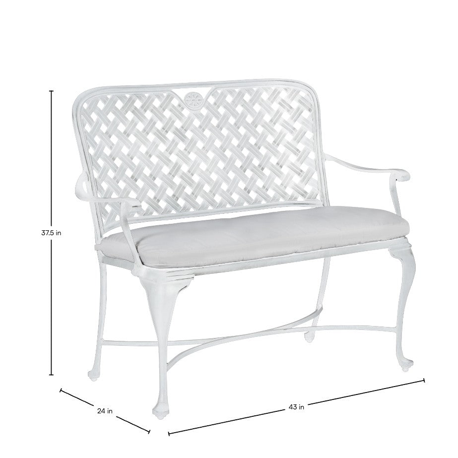 The styling of the Provance Bench evokes the relaxed elegance of the South of France. The bench features a double latticework design, scooped high back, and never-rust cast aluminum construction that is finished in an architectural-grade powder coating that is exceptionally weather resistant. This gracefully styled bench mixes well with a variety of metal patio sets. This item is designed to be enjoyed either with or without a cushion. Please designate your choice in the below "Select a Cushion" dropdown.