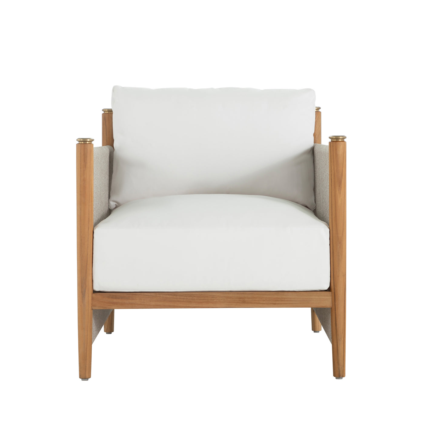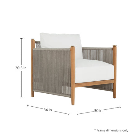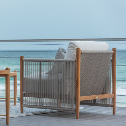 The Pacifica Lounge Chair marries modernity and natural beauty, featuring a teak frame with vertical olefin rope, known for its durability and weather-resistance, and brass toppers destined to patina beautifully. Plush cushions enhance comfort, while the unique rope back offers support and style. This collection, designed for durability promises longevity, weather resistance, and minimal maintenance. Please note, that due to its high-quality center cut, and natural oils, teak will age gracefully without the help of cleaners and protectors.