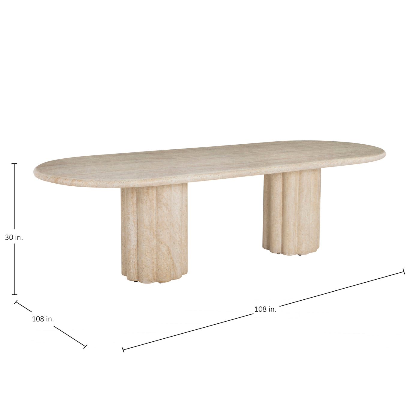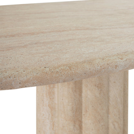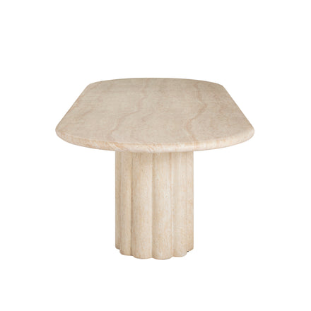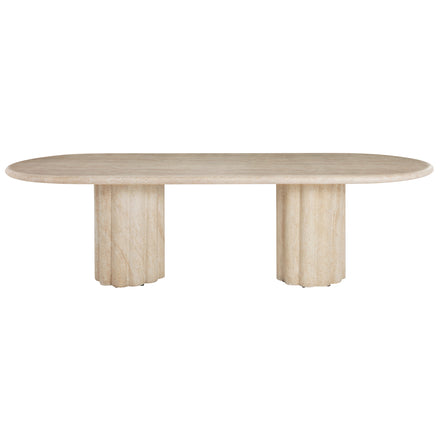 Sculptural yet streamlined, the Delphi Oval Dining Table offers an inviting centerpiece for gatherings. Its gently scalloped base flows seamlessly to the ground, balancing the strength of stone with the graceful fluidity of hand-carved craftsmanship. Made from our expertly crafted cast stone material—a blend of natural crushed stone and specialized binder—it’s designed for enduring strength and beauty in any environment. The new Roman Travertine finish enhances its organic appeal, recreating the depth and nuance of real travertine with stunning realism. With a soft-edged tabletop and refined presence, this table brings sculptural serenity to dining spaces indoors or out.