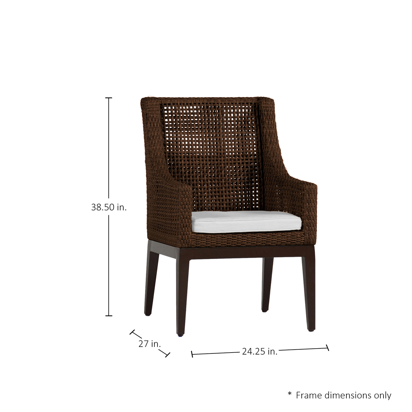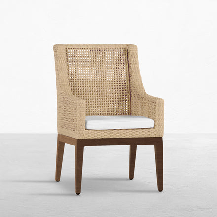 The Peninsula Woven Arm Chair, with its meticulous craftsmanship and sturdy design, offers a touch of timeless elegance. Made from our robust, handwoven N-Duraâ„¢ resin wicker, this chair is not only stylish but built to last. Its open weave provides a light and sophisticated look, perfect for creating an inviting outdoor dining area or a standalone statement piece in your garden or on your patio. This chair's material is engineered for longevity, featuring UV resistance integrated within the wicker to prevent fading and maintain structural integrity. Tested rigorously, the wicker is proven to withstand extensive UV exposure, guaranteeing that the chair retains its beauty for approximately five years of realistic use. This item is designed to be enjoyed either with or without a cushion. Please designate your choice in the below "Select a Cushion" dropdown.