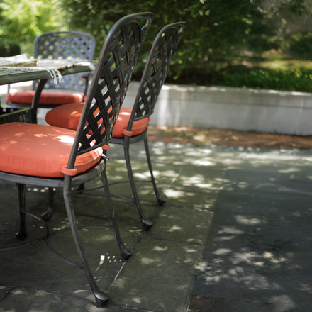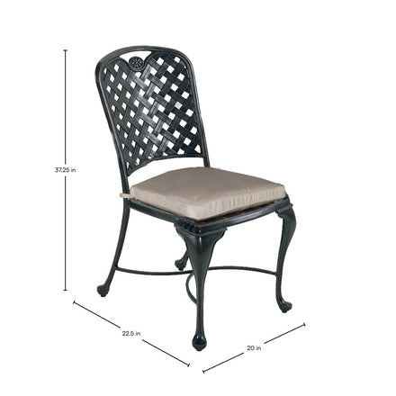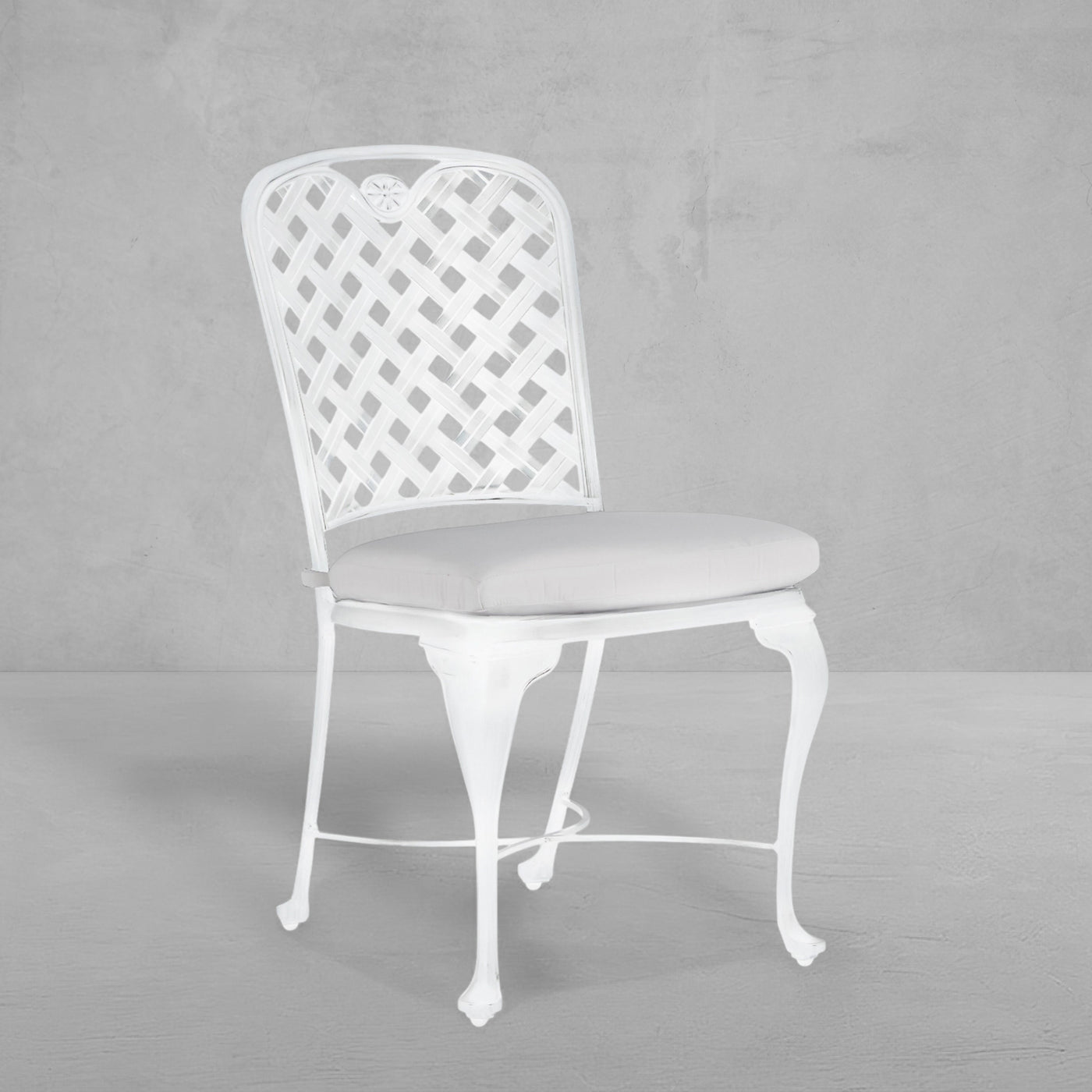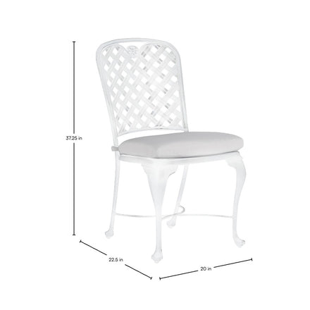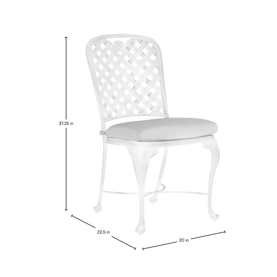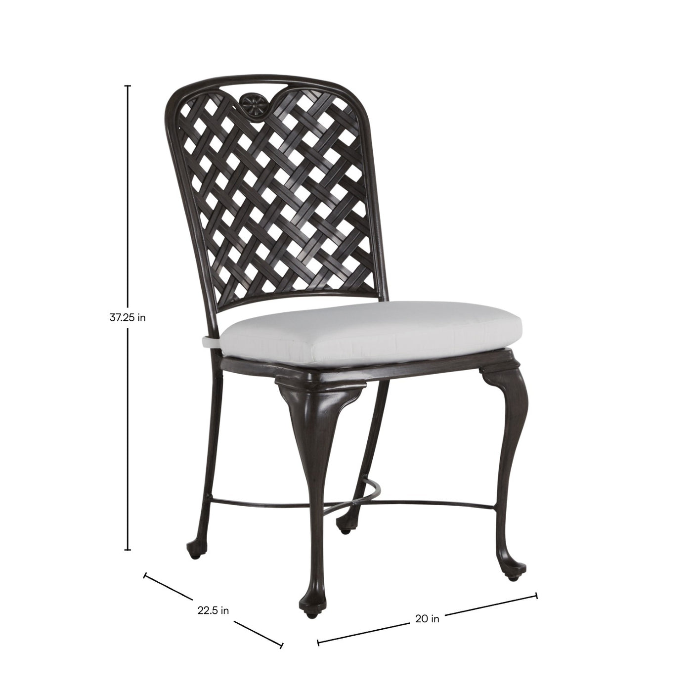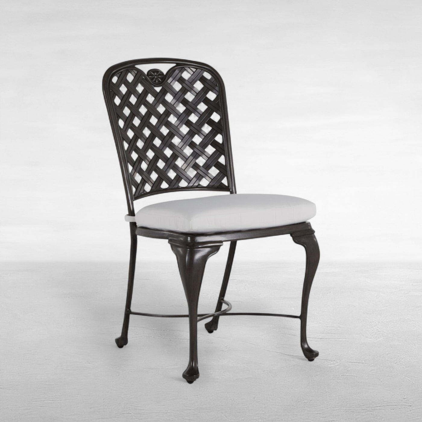 The styling of the Provance Side Chair evokes the relaxed elegance of the South of France. The chair features a double latticework design, scooped high back, and never-rust cast aluminum construction that is finished in an architectural-grade powder coating that is exceptionally weather resistant. This gracefully styled side chair mixes well with a variety of outdoor settings. This item is designed to be enjoyed either with or without a cushion. Please designate your choice in the below "Select a Cushion" dropdown.