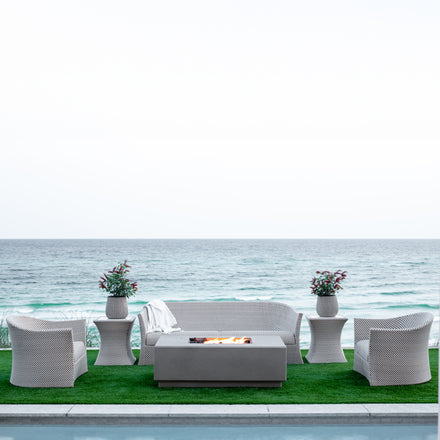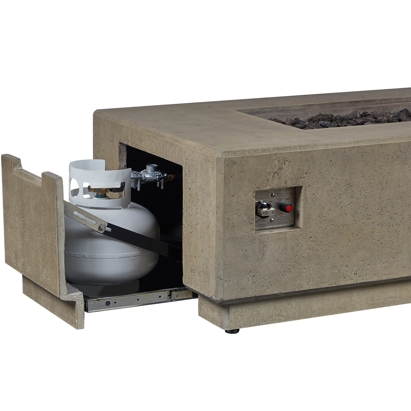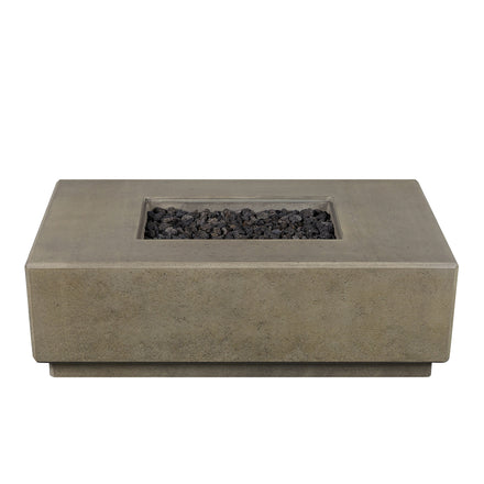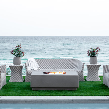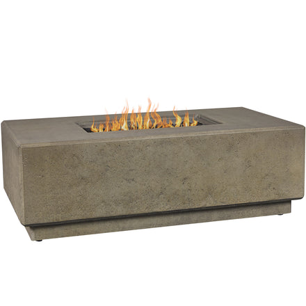 The Sorrento 56” Fire Pit Table combines sculpted modern design with artisan craftsmanship for a statement-making centerpiece in any outdoor space. Handcrafted in the USA from glass fiber reinforced concrete (GFRC) with a steel inner frame, it offers a durable, weather-resistant structure with a rustic yet refined finish. A premium linear brass burner provides bold, even flames, while the generous 56” rectangular size creates the perfect gathering place for friends and family. The propane model offers convenience and flexibility with a hidden 11 lb propane tank compartment that keeps your setup clean and uncluttered—no visible hoses or tanks. With a powerful 65,000 BTU output, this fire pit delivers impressive warmth and ambiance for any occasion. Designed for ease of use, it features a battery-operated push-button ignition and adjustable flame height, so you can set the mood instantly.