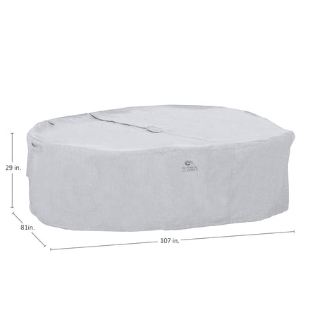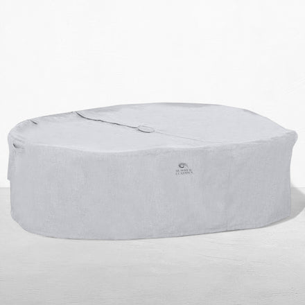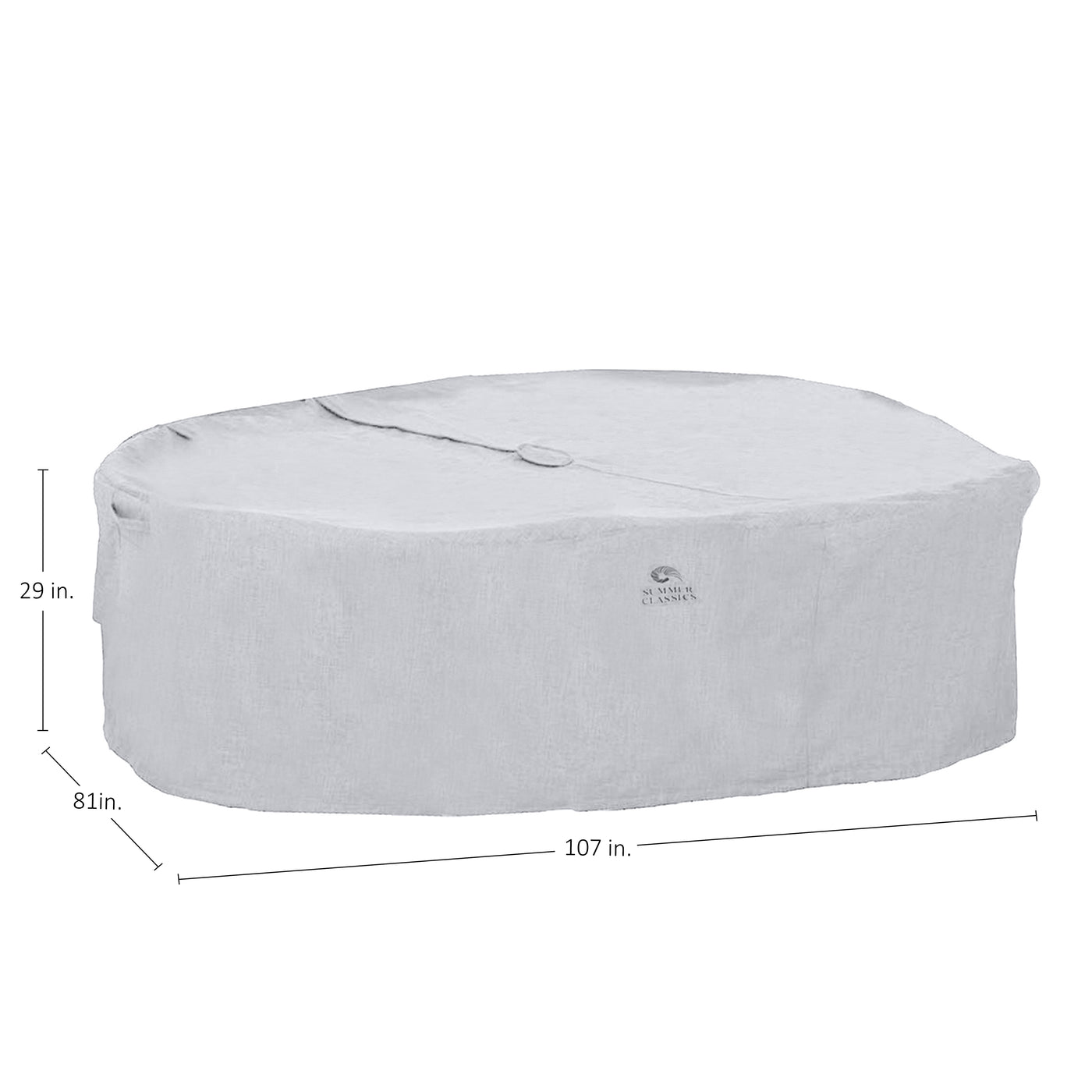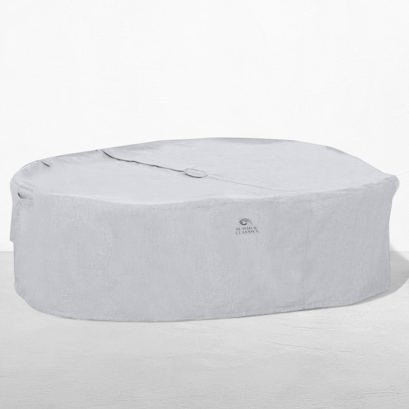 Designed to accommodate large rectangular table sets, this model includes a central opening for umbrella poles. The high-tenacity polyester fabric and water-resistant PVC coating offer year-round protection from UV rays, moisture, and wind. Its heavyweight construction ensures a secure fit, while thoughtful tailoring allows for easy use, even around umbrella bases. A practical solution for both residential and commercial settings.