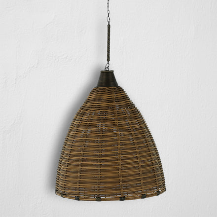 The Prescott Outdoor Chandelier Large embodies a blend of rustic charm and contemporary design, featuring a substantial size of 36.75"x36.75"x43.75". Its construction utilizes N-Dura™ resin wicker, known for its durability, low-maintenance, and UV and weather-resistant properties. Using this material ensures the chandelier retains its beauty with minimal care. The multi-tonal, thicker wicker weave adds texture and depth, enhancing its visual appeal. The large chandelier is designed to make a statement in outdoor spaces, using one 100-watt lightbulb and accompanied by a 12' chain for versatile hanging options. Its robust yet stylish design makes it suitable for various outdoor settings, providing both functionality and aesthetic appeal.