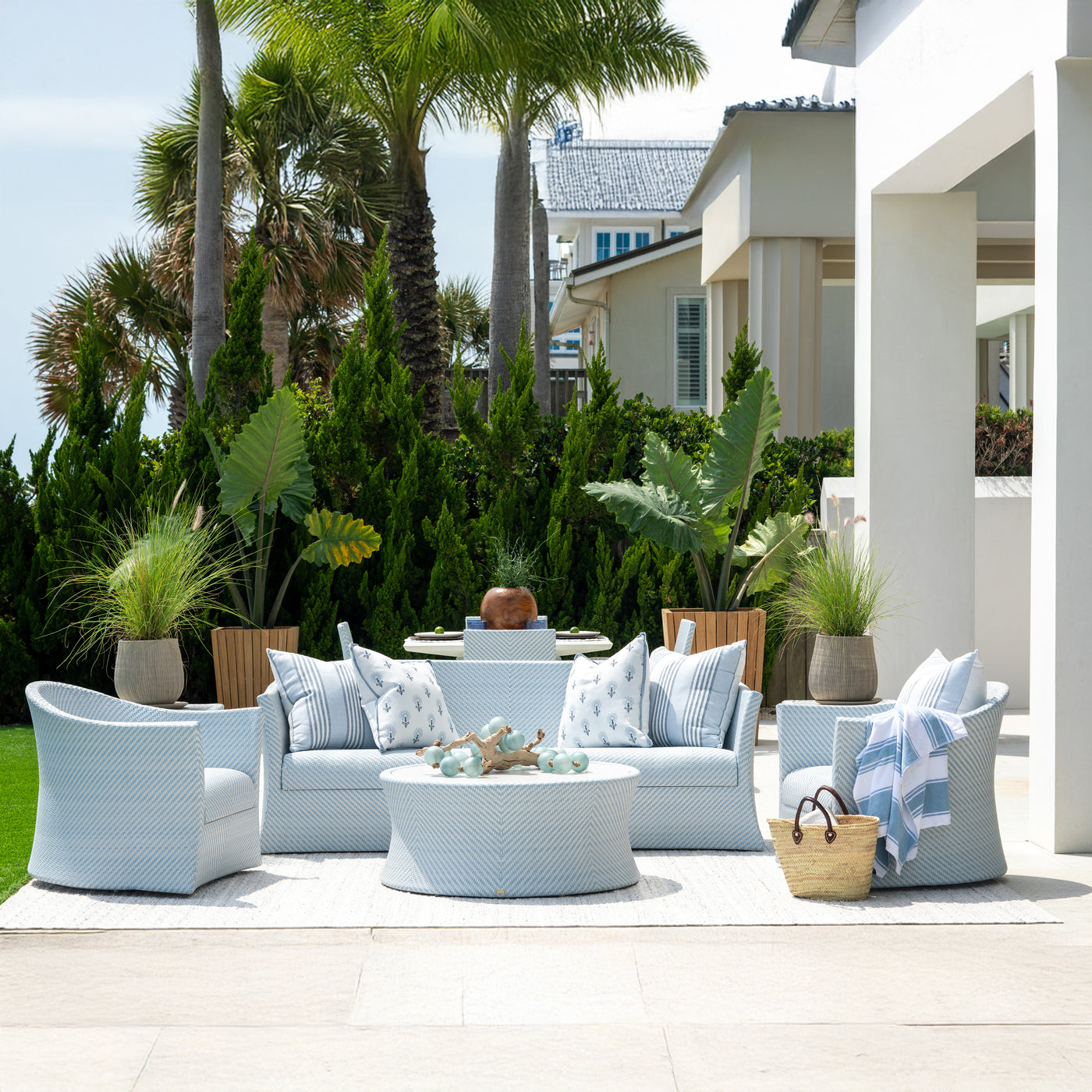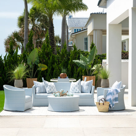 The Bari Swivel Lounge pairs timeless elegance with smooth, functional motion—rotating a full 360 degrees for dynamic outdoor relaxation. Fully wrapped in the collection’s signature two-tone chevron N-Dura™ resin wicker, it brings durability and visual texture to any setting. Designed for poolside or humid environments, it features a built-in water-resistant reticulated foam cushion for plush comfort without the need for traditional removable cushions. Its curved silhouette and generous proportions offer a stylish, low-maintenance retreat ideal for both lounging and conversation.