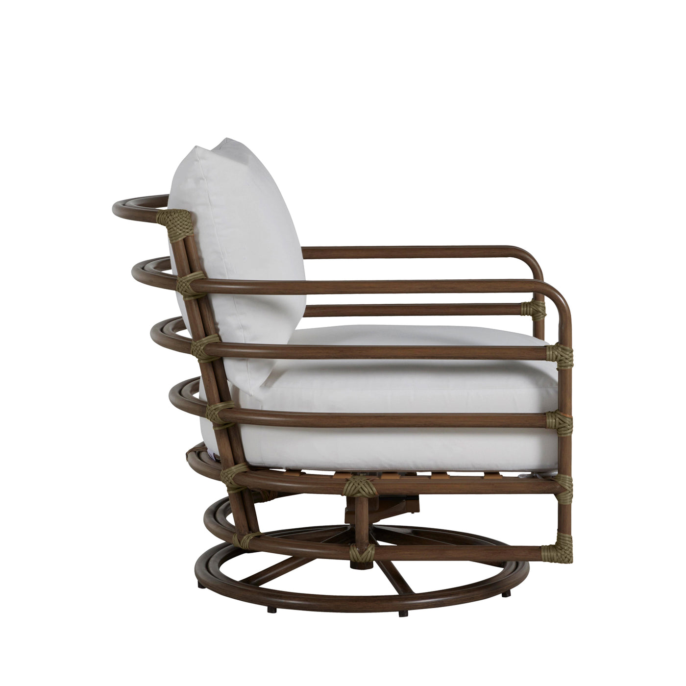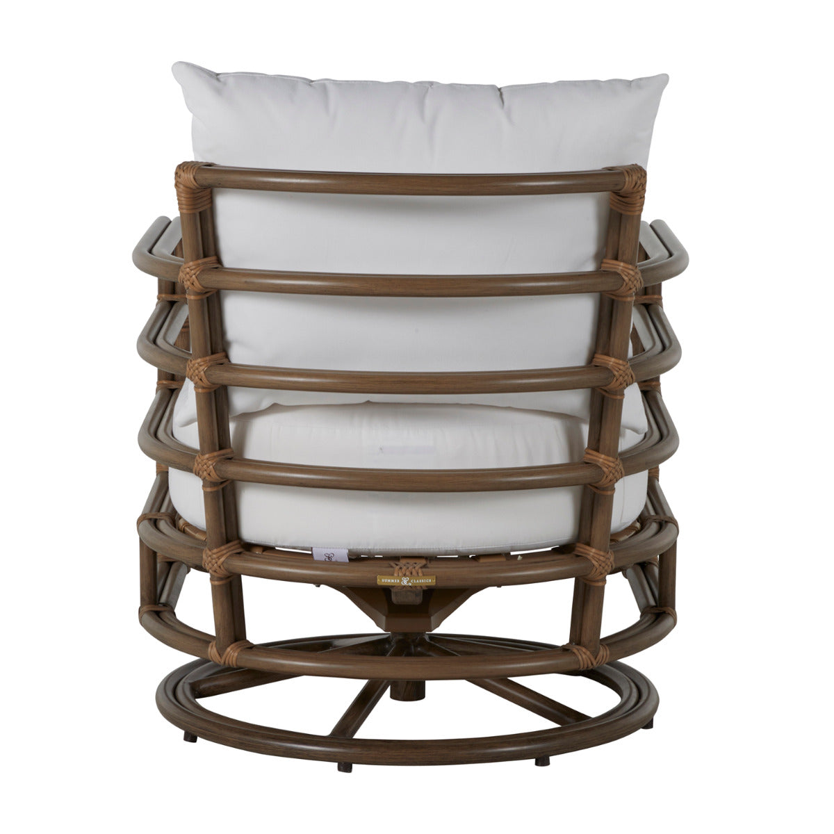 Our Malibu Swivel Rocker adds a touch of coastal elegance to any space while also merging the best of both vintage aesthetics and modern functionality. Inspired by the classic look of natural rattan, this rocker features a high-quality wrought aluminum frame and N-Duraâ„¢ resin weaving, presenting a striking contrast with its oak and burlap-inspired finishes. The crossover joints mimic traditional binding work, enhancing the style and visual contrast. Providing the ultimate level of motion and flexibility, the Malibu Swivel Rocker offers the ability to rock back and forth as well as swivel side to to side. For customers seeking value in outdoor furniture, the Malibu Swivel Rocker provides exceptional durability, easy movement, and timeless style.